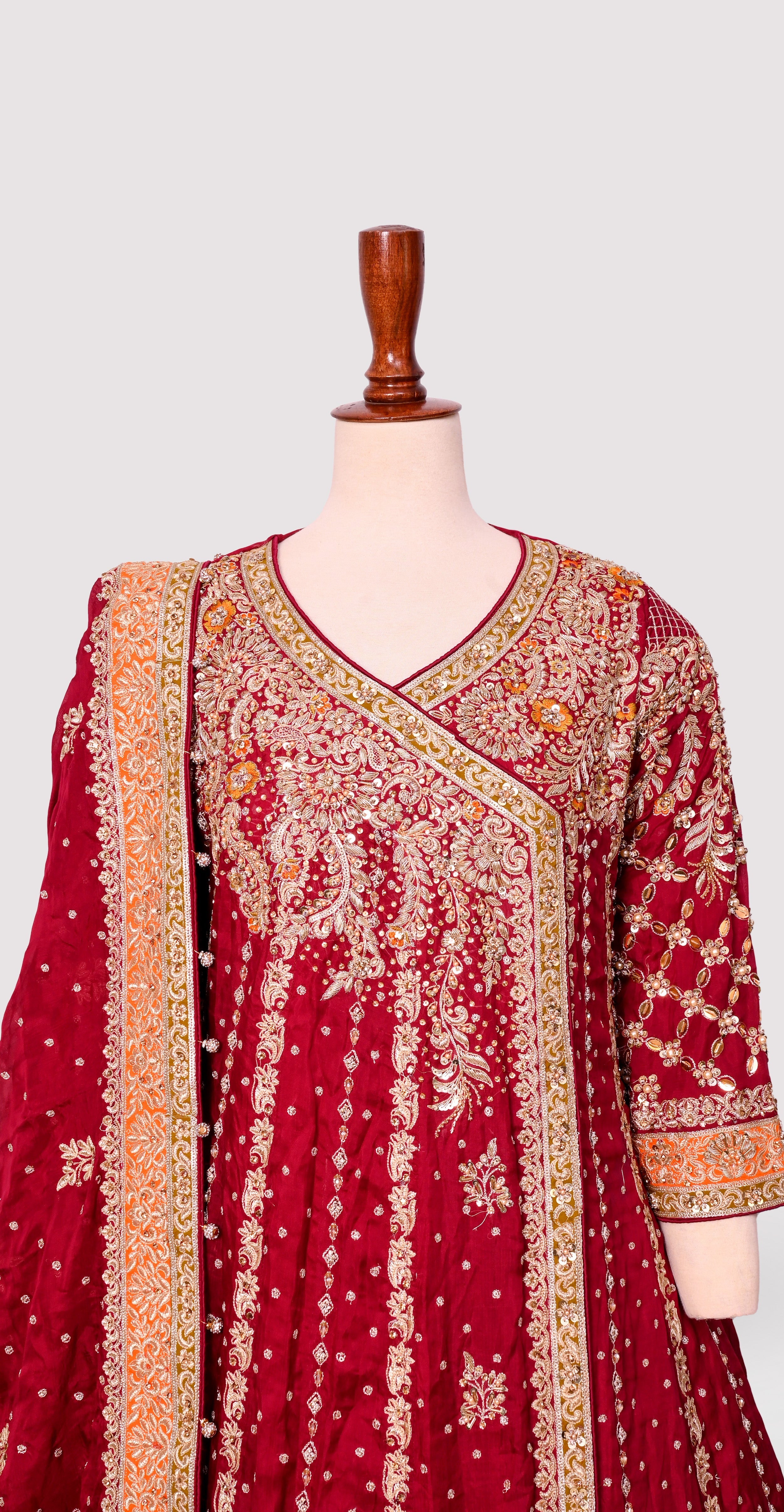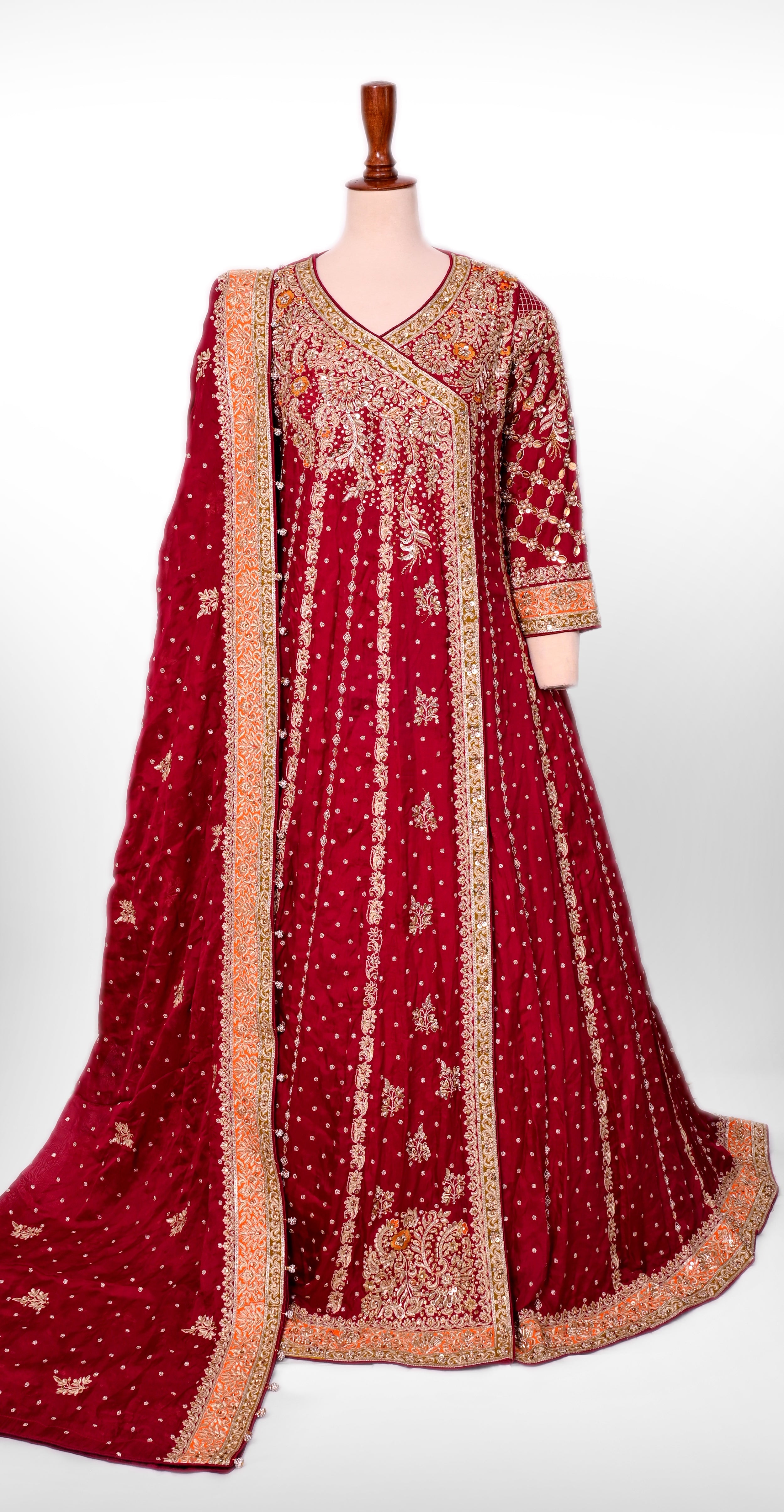Description: The silk maxi and dupatta is adorned with exquisite hand and machine embroidery. Traditional embellishments such as intricate kora, zari, pearls and stones.