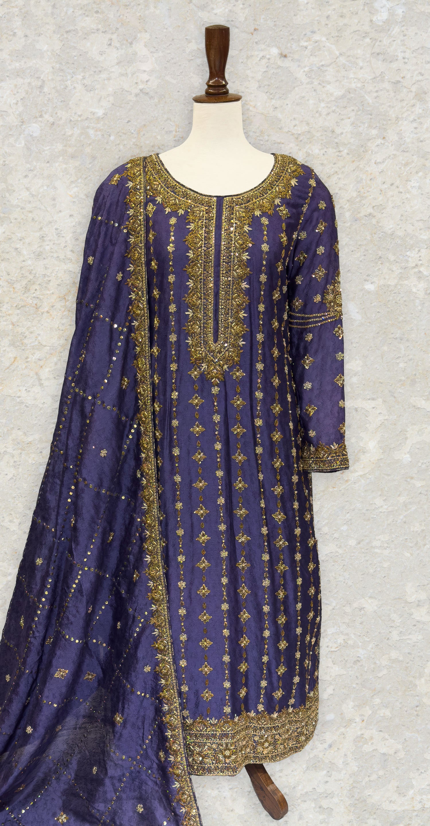 An ode to timeless craftsmanship — this ensemble is rendered in luxurious Sheesha Silk, adorned with pure hand-made Zardozi and delicate Kacha work, paired with a shimmering Kamdani dupatta that reflects ethereal grace. The straight-cut silhouette in a deep Lavender hue evokes regal sophistication and effortless poise.