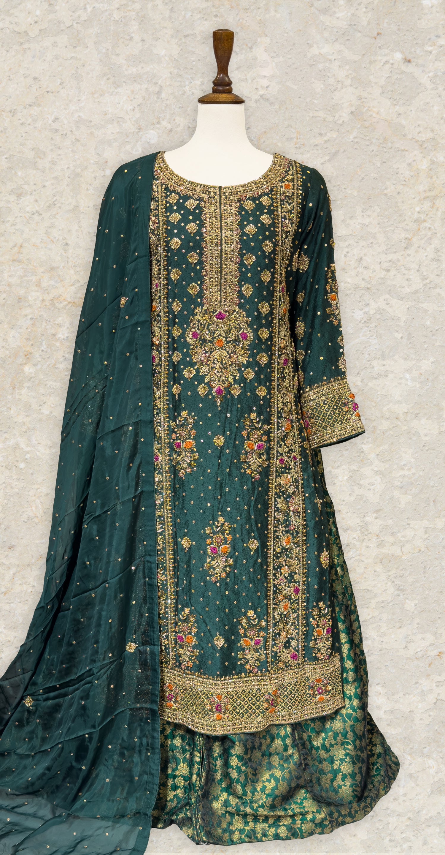 Adorned with pure hand-embroidered Zardozi kacha work, each motif captures the essence of regal artistry and traditional grace.