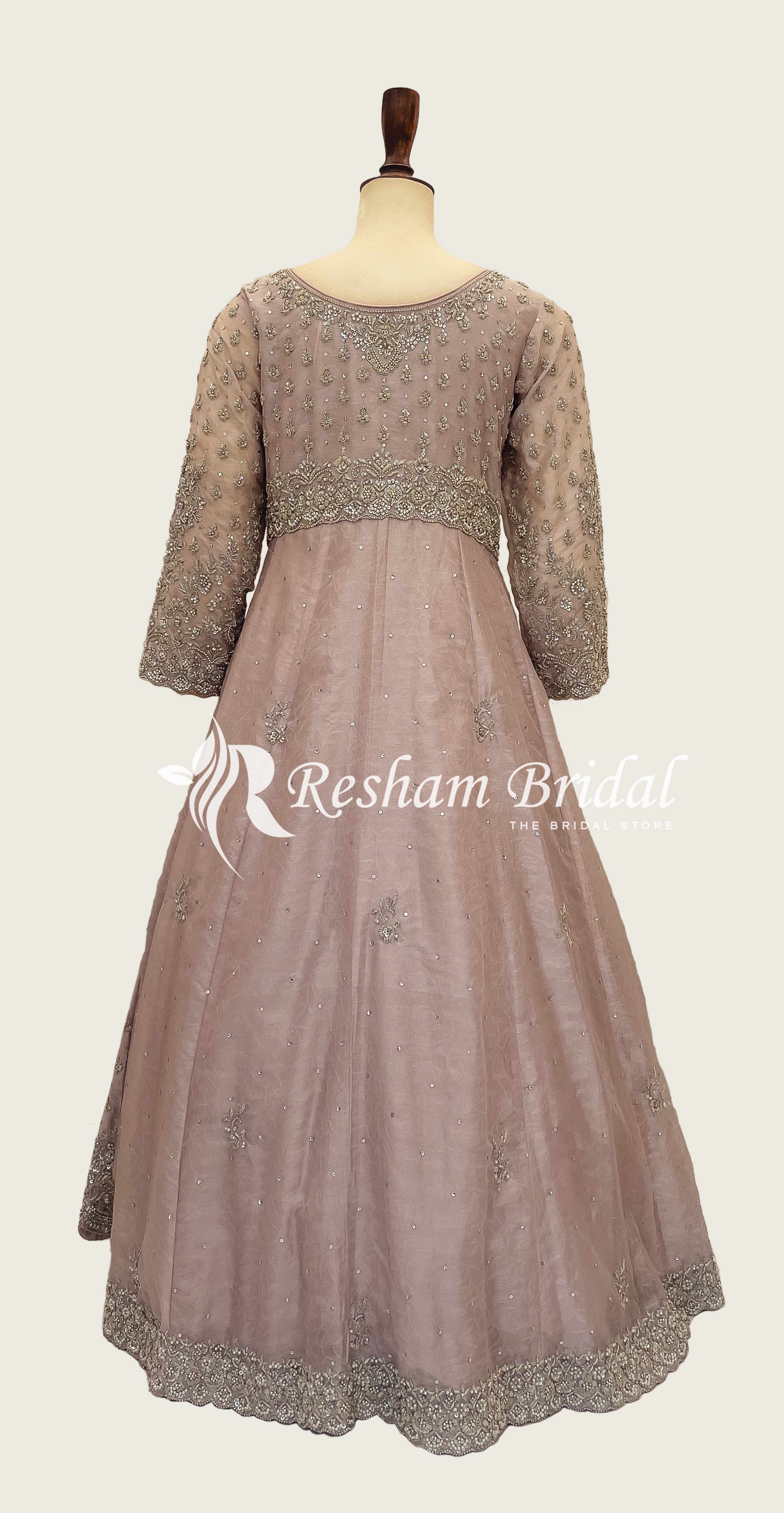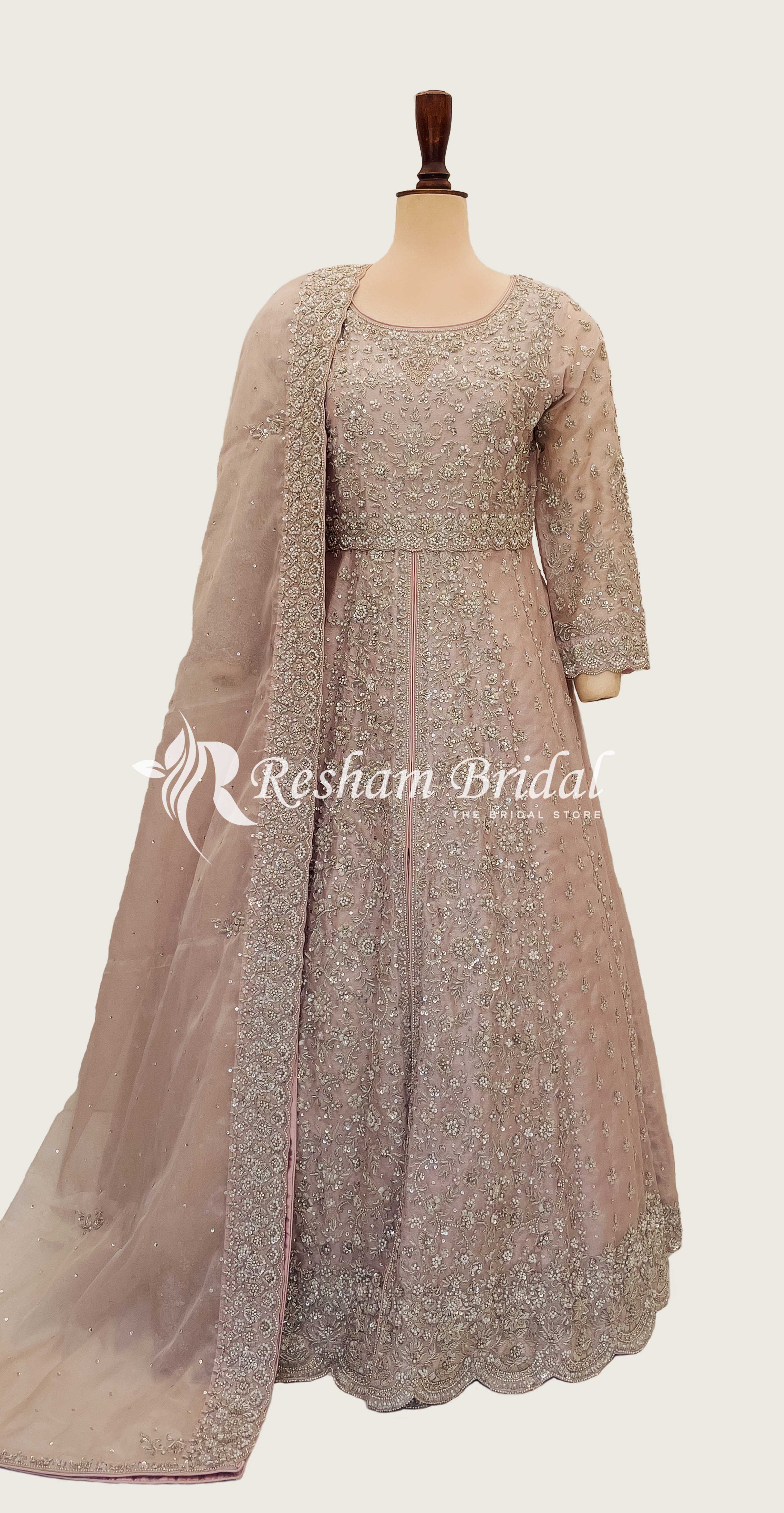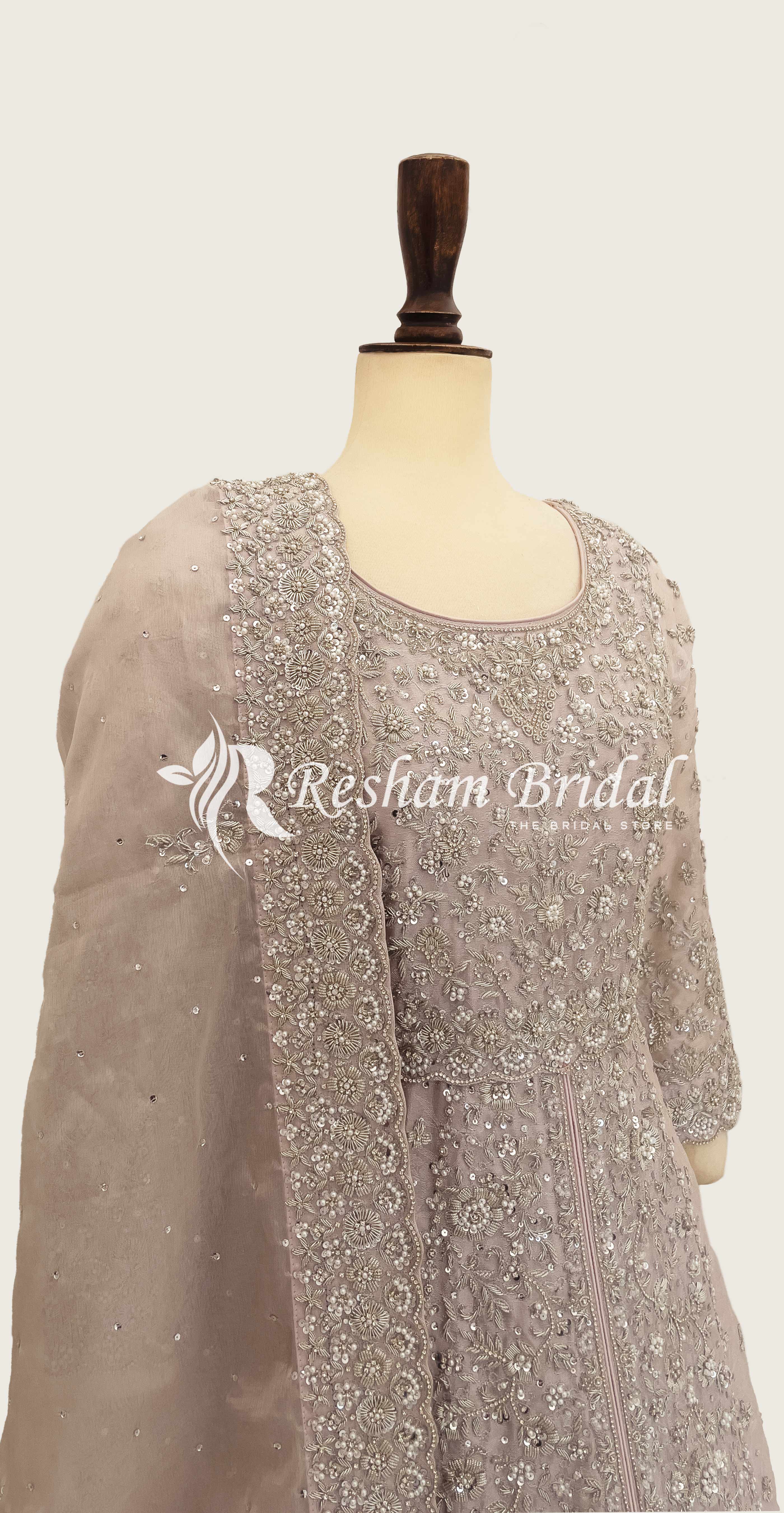 Description: The lama tissue maxi and mesouri dupatta is adorned with exquisite hand embroidery. Traditional embellishments such as intricate kora, dabka, pearls and stones.