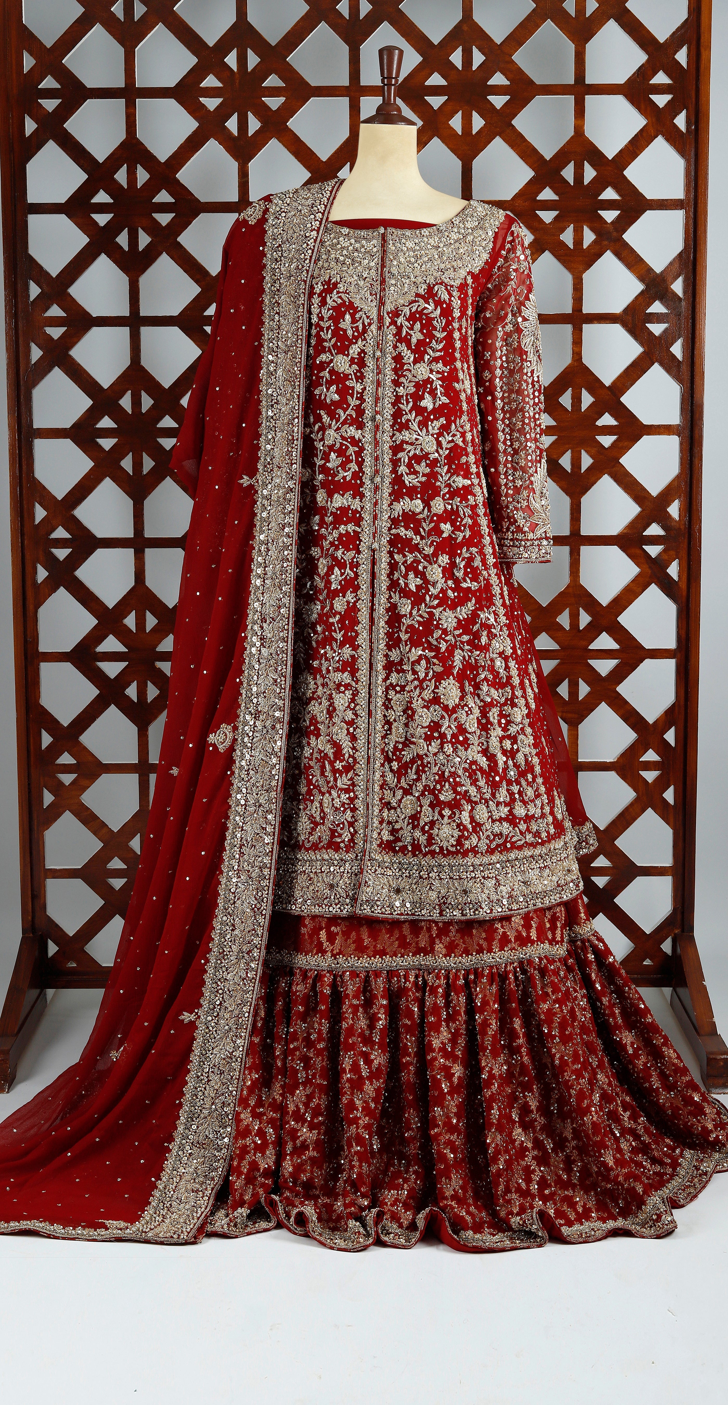 Description: The maxi length shirt with full sleeves is adorned with exquisite hand embroidery. Traditional embellishments such as intricate kora, dabka,pearls,stone and sitara.The timeless shirt is complemented with a maroon, lengha of banarsi chiffon.