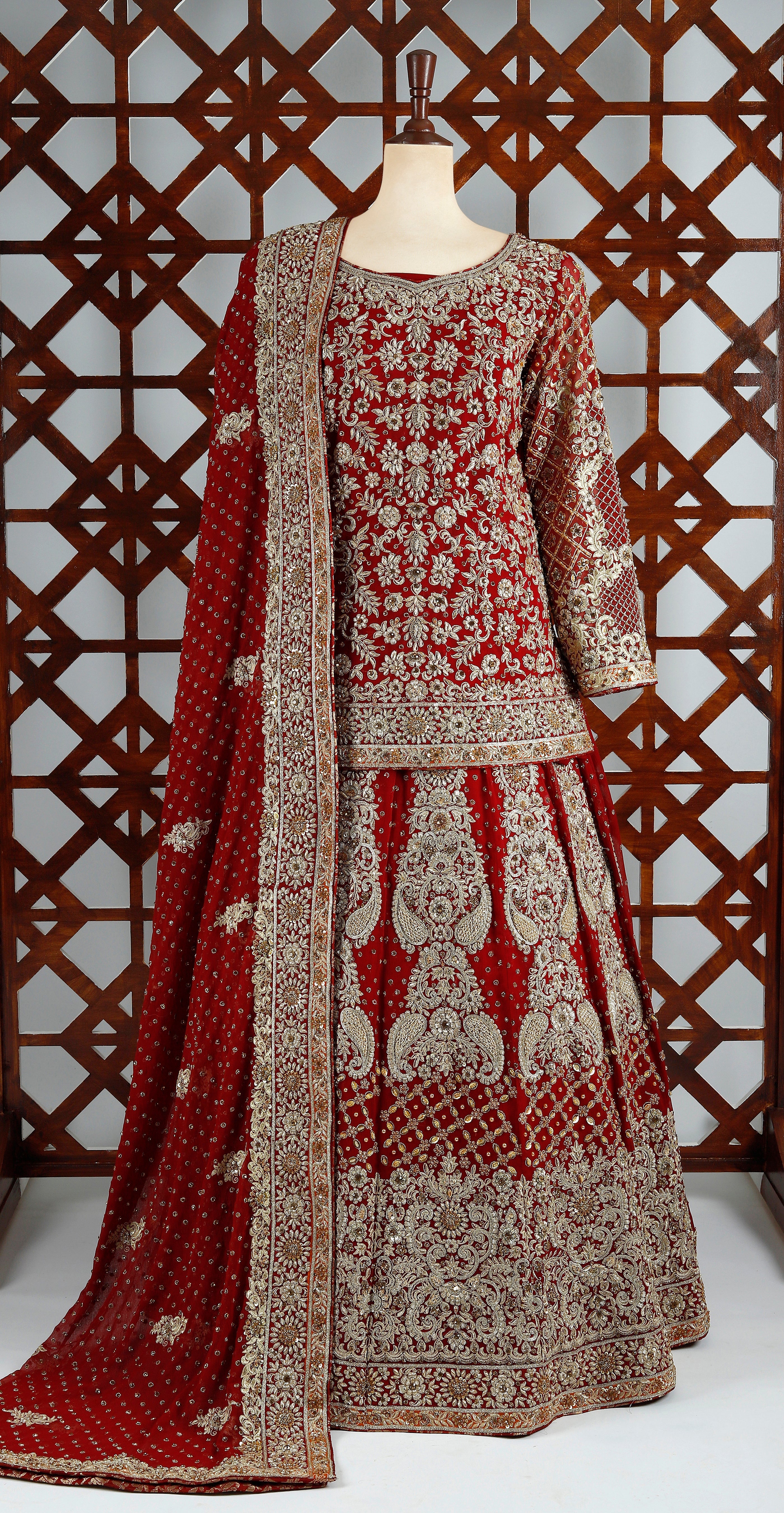Description: The chiffon shirt is adorned with exquisite hand embroidery. Traditional embellishments such as intricate kora, dabka,pearls,stone and sitara. The timeless shirt is complemented with a maroon, lengha in chiffon fabric.