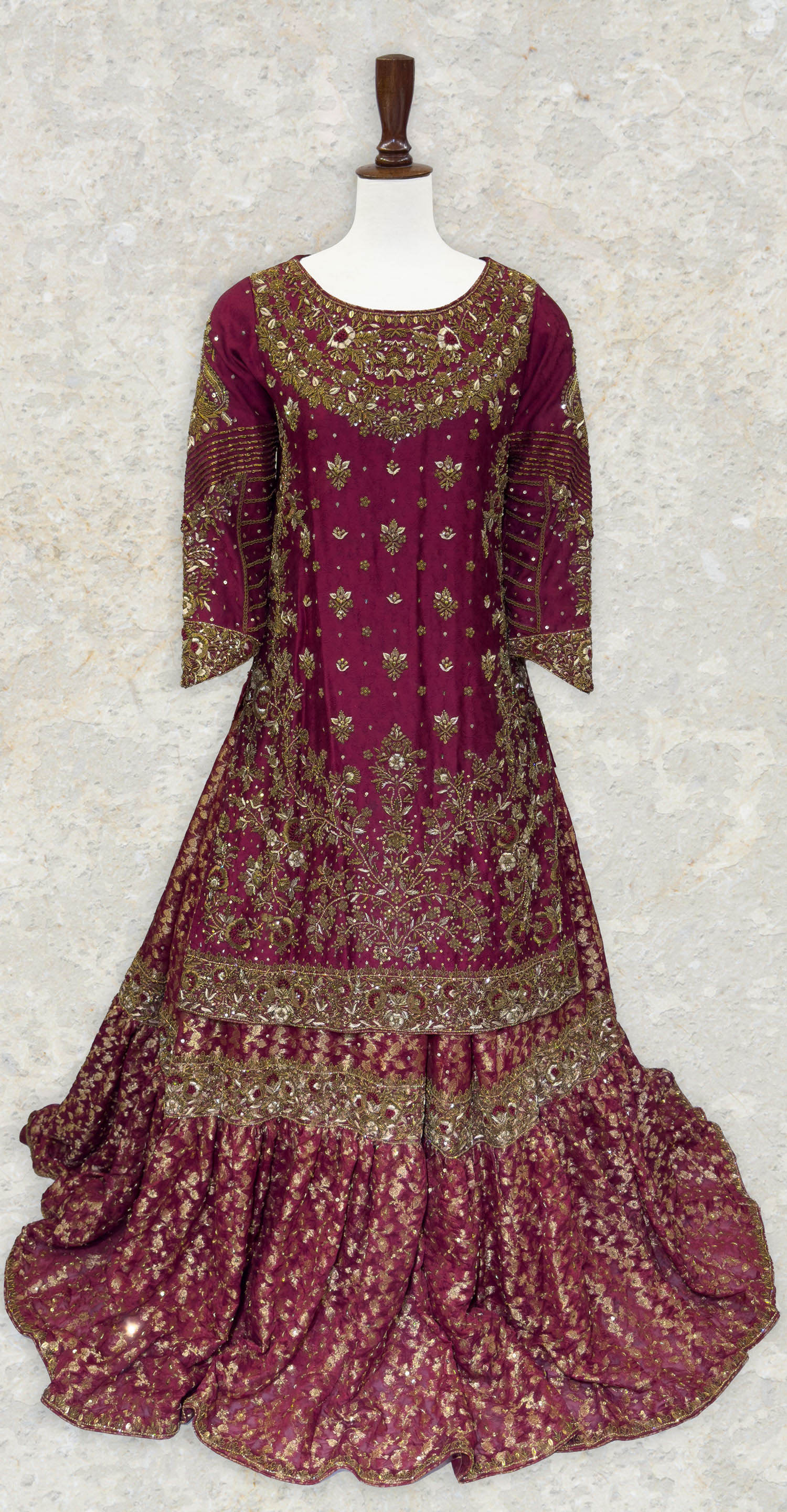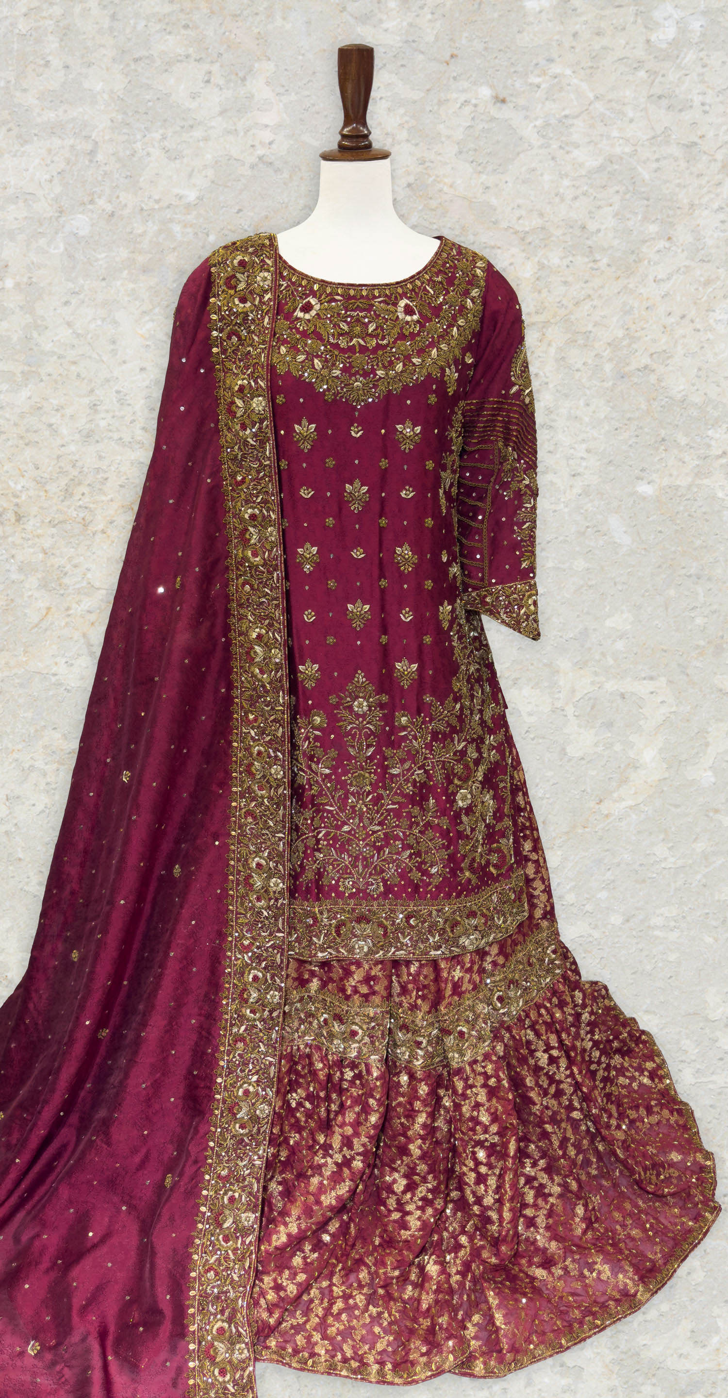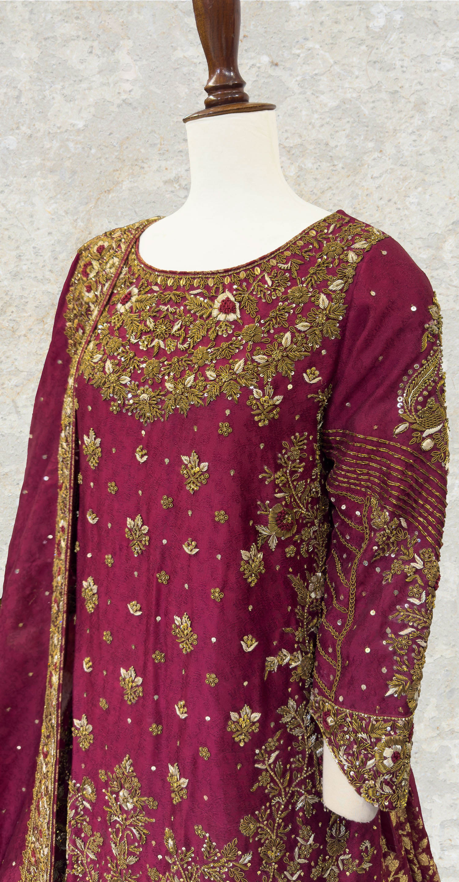 An opulent creation crafted from Sheesha Silk with Banarsi Chiffon, this ensemble embodies regal grace and heirloom artistry. Adorned with pure hand-made Zardozi and intricate Kacha work, every detail is a testament to timeless craftsmanship. The straight shirt paired with a Farshi lehenga flows with royal grandeur, while the ruby red hue symbolizes passion, elegance, and power — perfect for the modern muse with a classic soul.