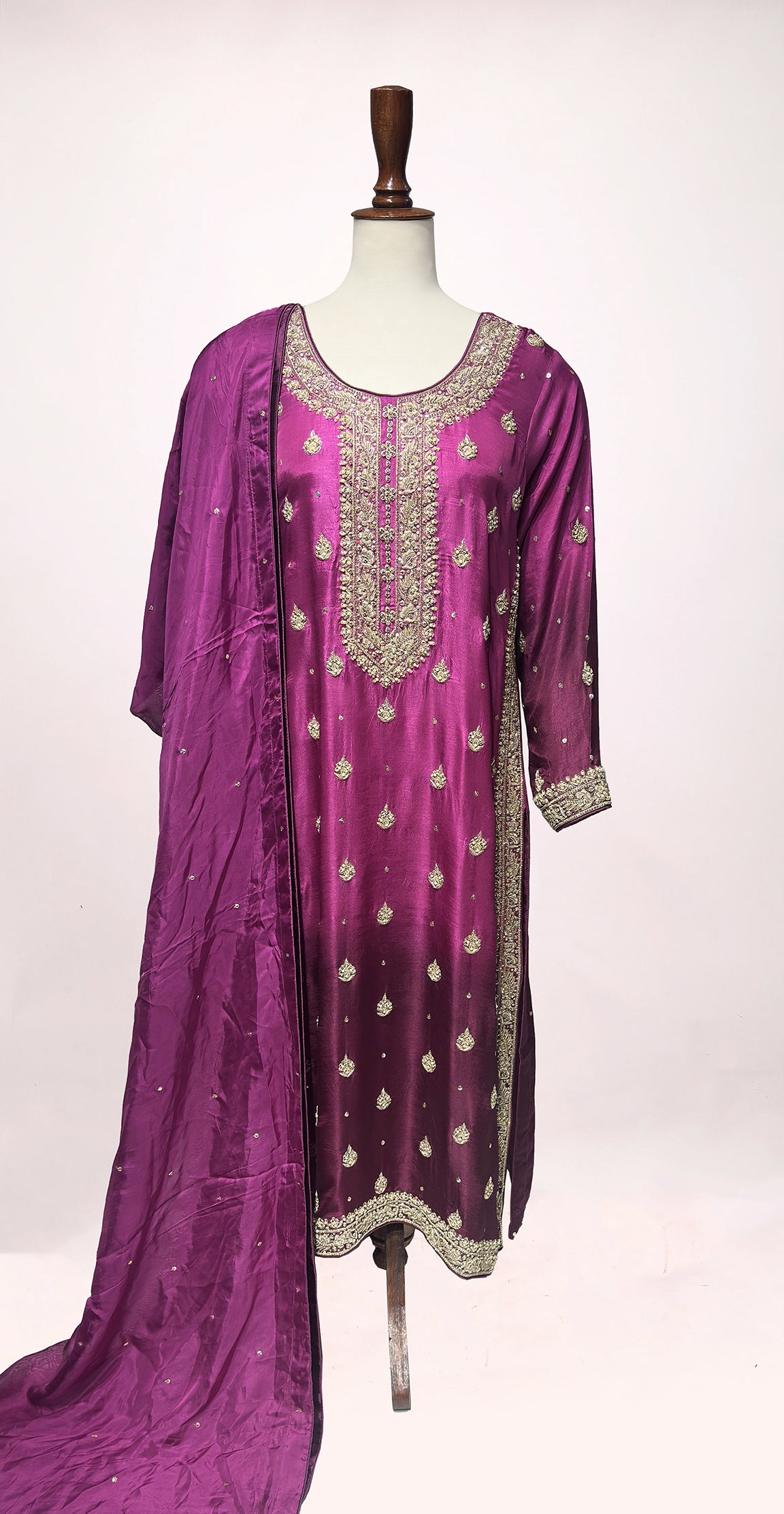 Paired with a matching dupatta and shamoos silk trouser in a hot pink tone, finished with a subtle border and fine embellishments, this outfit exudes sophistication. Its graceful silhouette and rich craftsmanship make it an ideal choice for weddings, festive gatherings, or formal evening occasions.