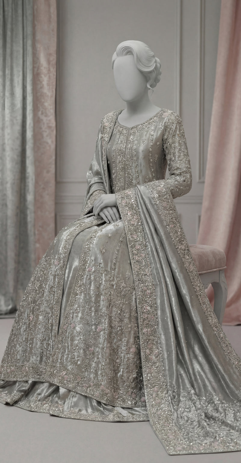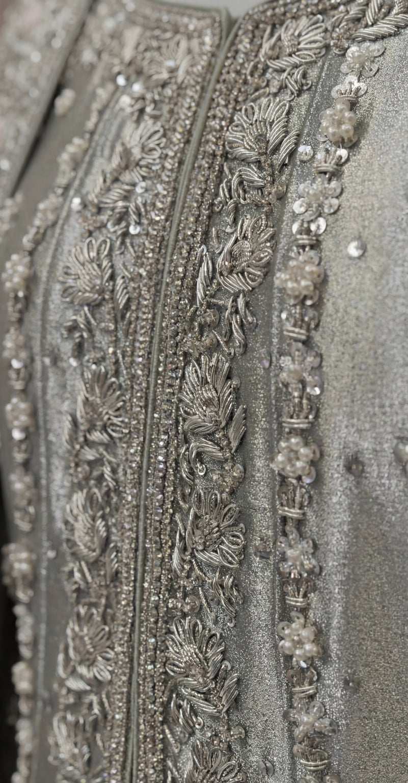 This light pistachio maxi is a refreshing expression of grace and refined craftsmanship. Crafted from luxurious lama silk, the flowing silhouette is adorned with pure hand-made Zardozi kacha work, creating a delicate yet regal look—perfect for festive occasions and formal gatherings.