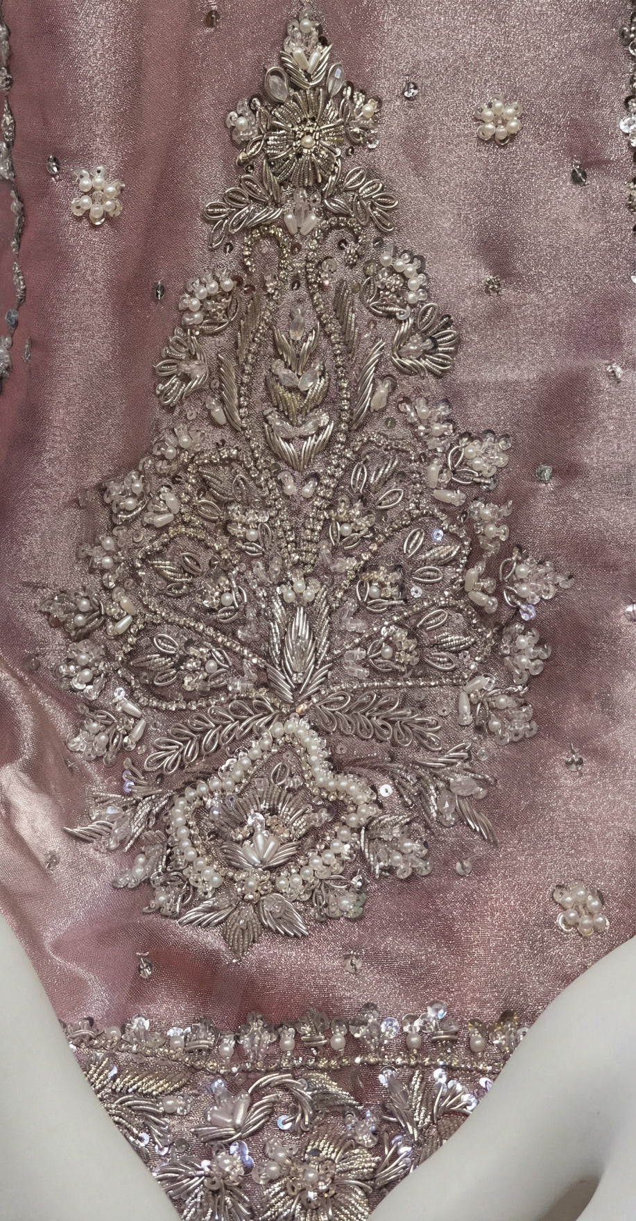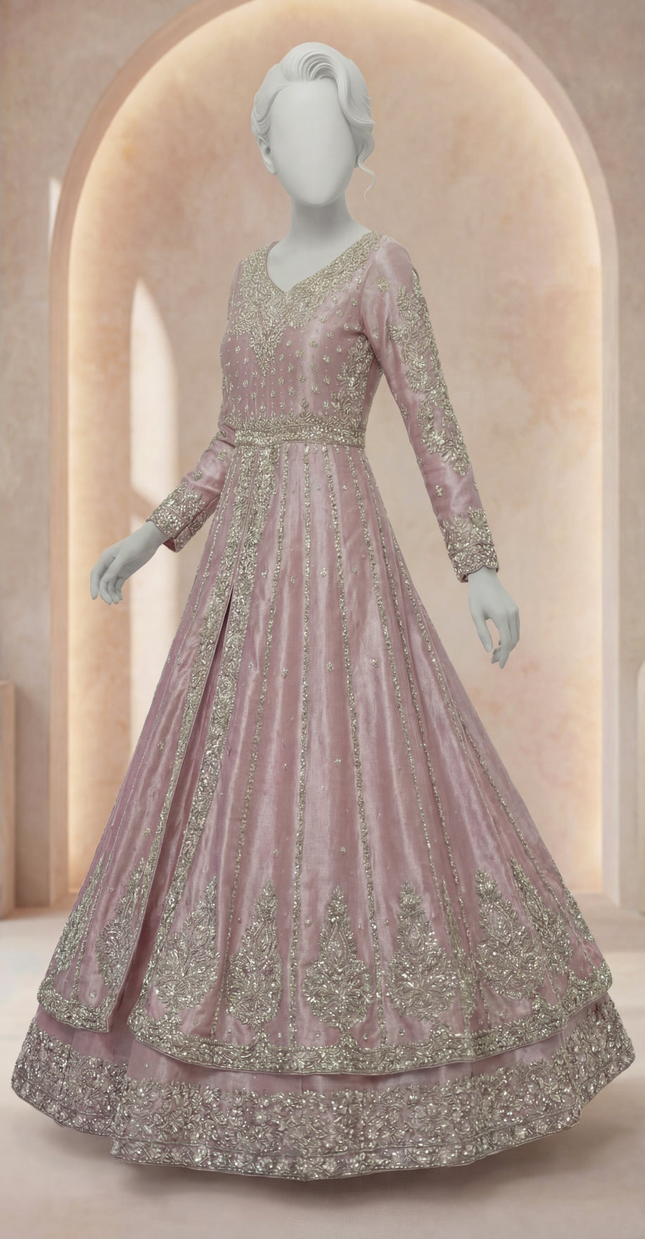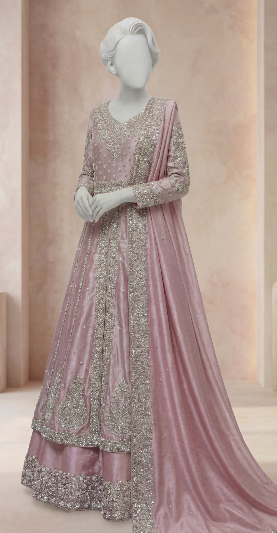 This pink maxi is a graceful expression of feminine elegance and timeless craftsmanship. Crafted from luxurious lama tissue, the flowing silhouette is adorned with pure hand-made Zardozi kacha work, creating a refined and radiant look—perfect for weddings, festive occasions, and formal gatherings.
