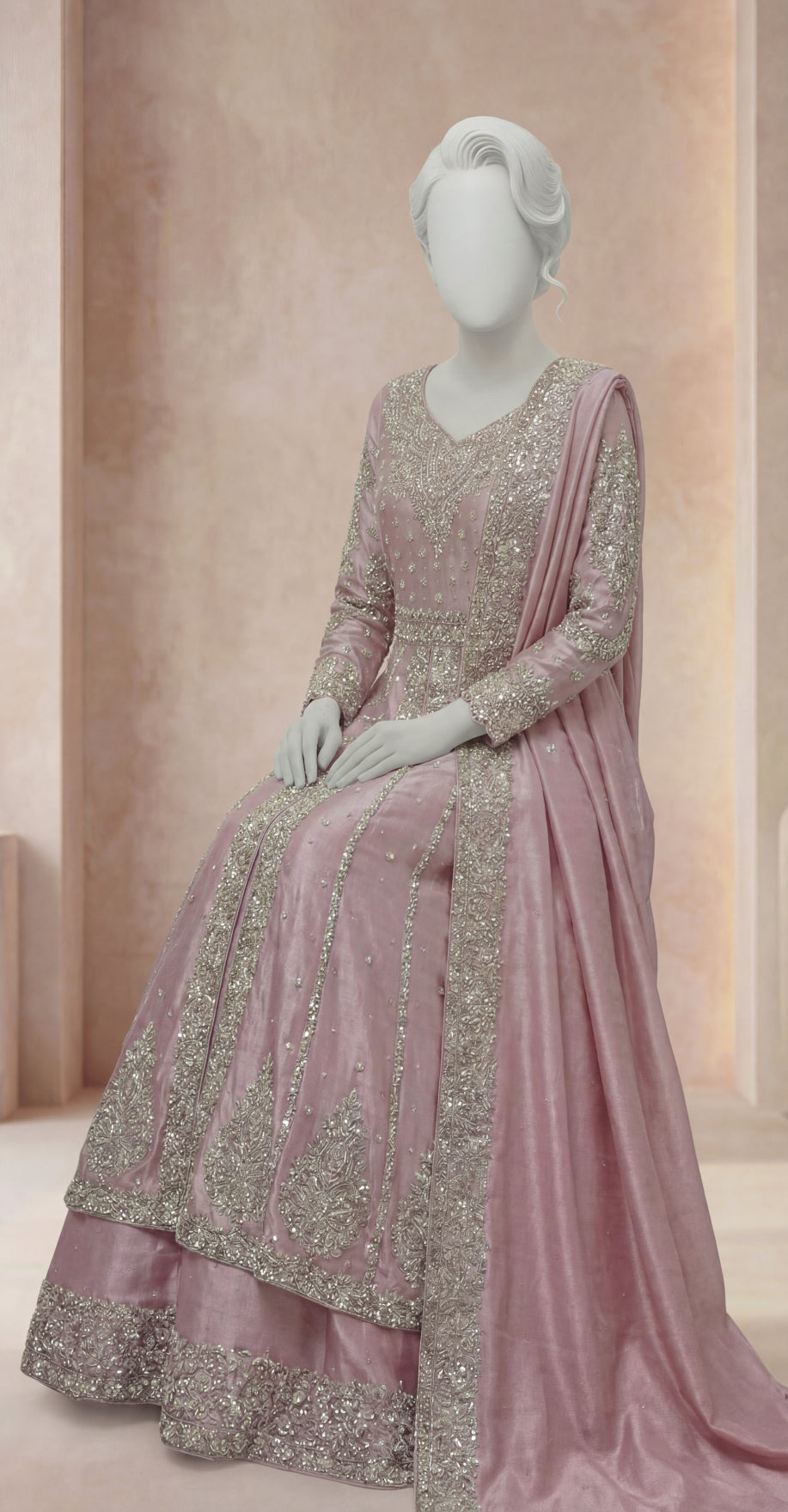 A beautiful fusion of handcrafted Zardozi artistry and soft pastel elegance.