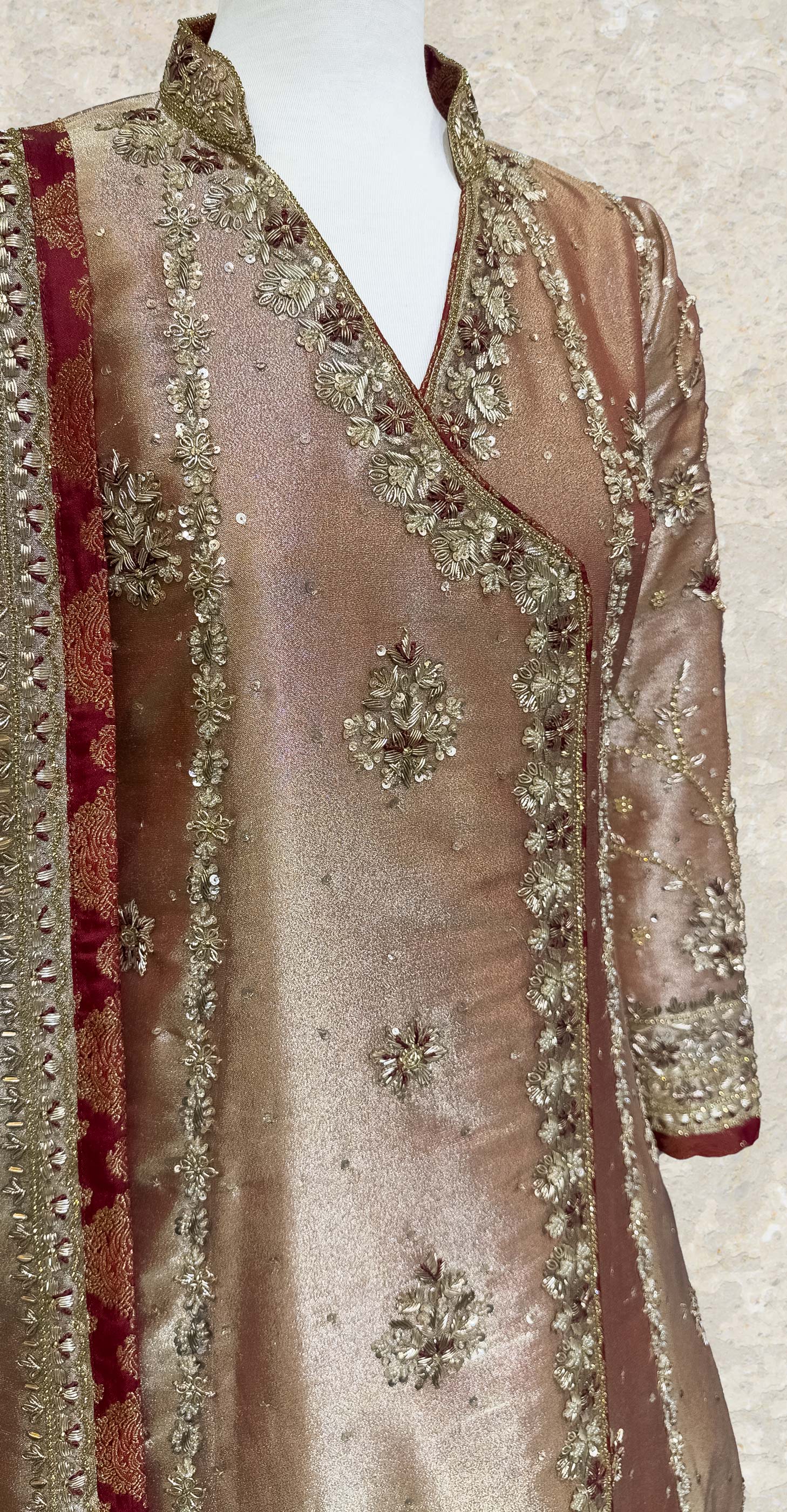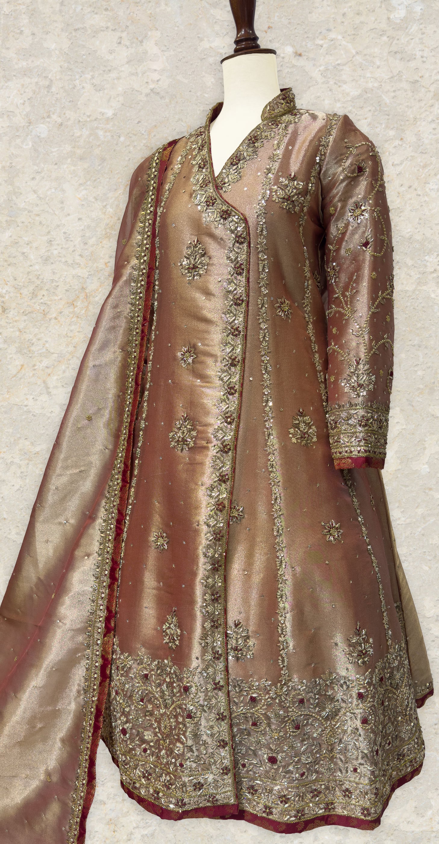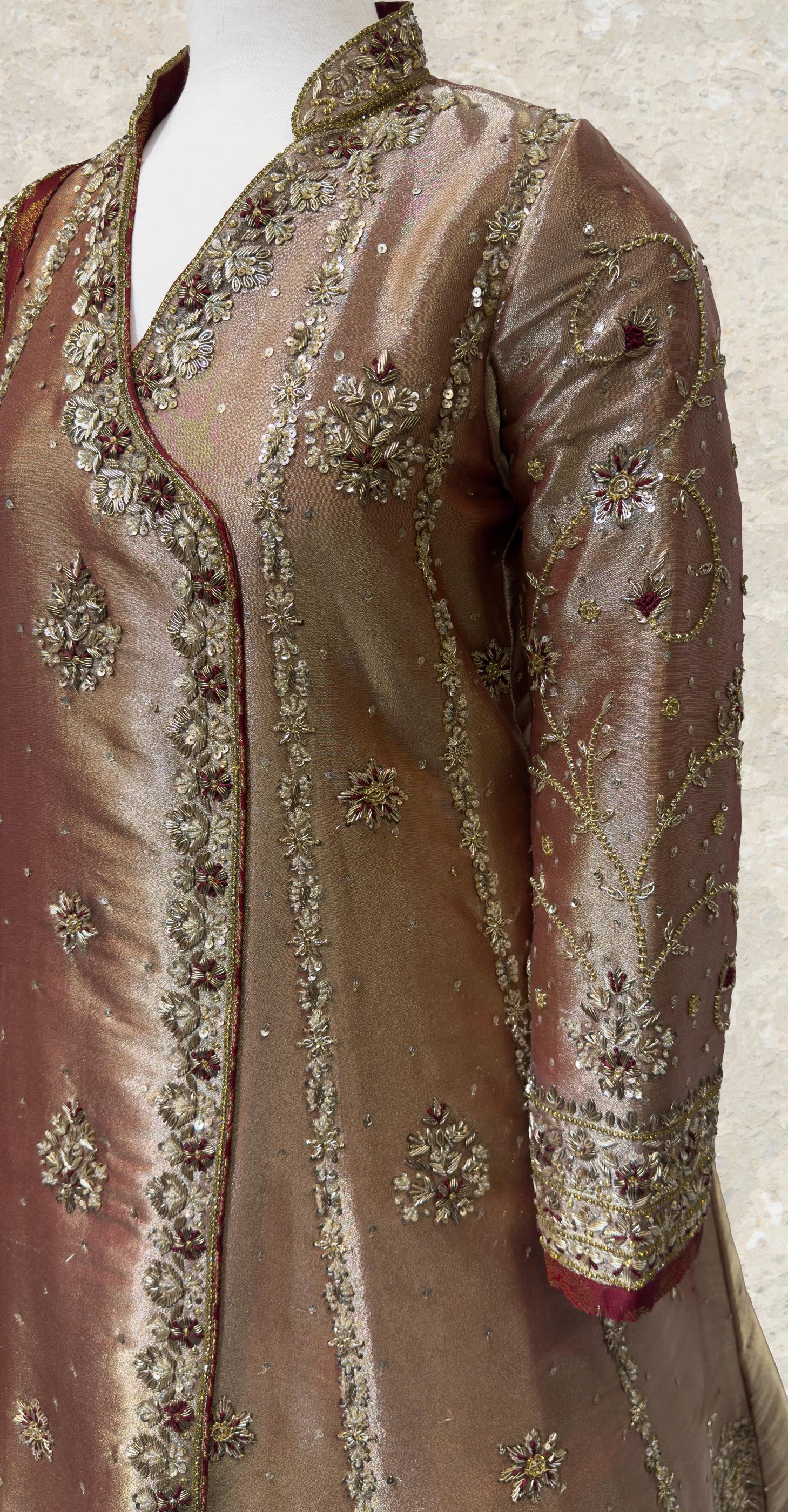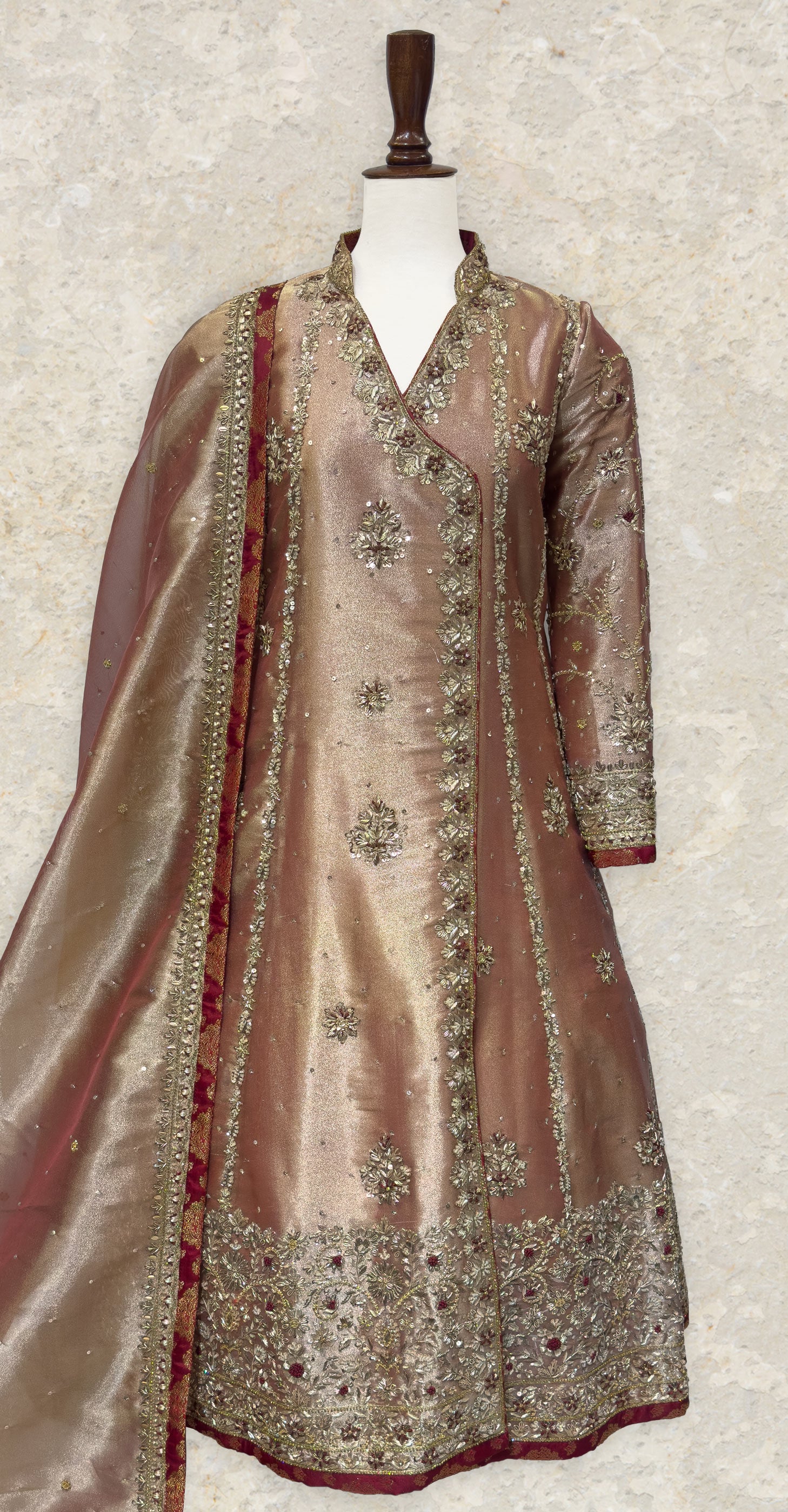 A royal Angrakha-style maxi beautifully crafted from luxurious Lama Tissue fabric. Adorned with pure hand-made Zardozi Kacha work, this ensemble reflects traditional artistry and timeless elegance. The stunning combination of Golden and Mehroon hues adds a regal touch, making it an exquisite choice for weddings, festive events, and formal occasions.