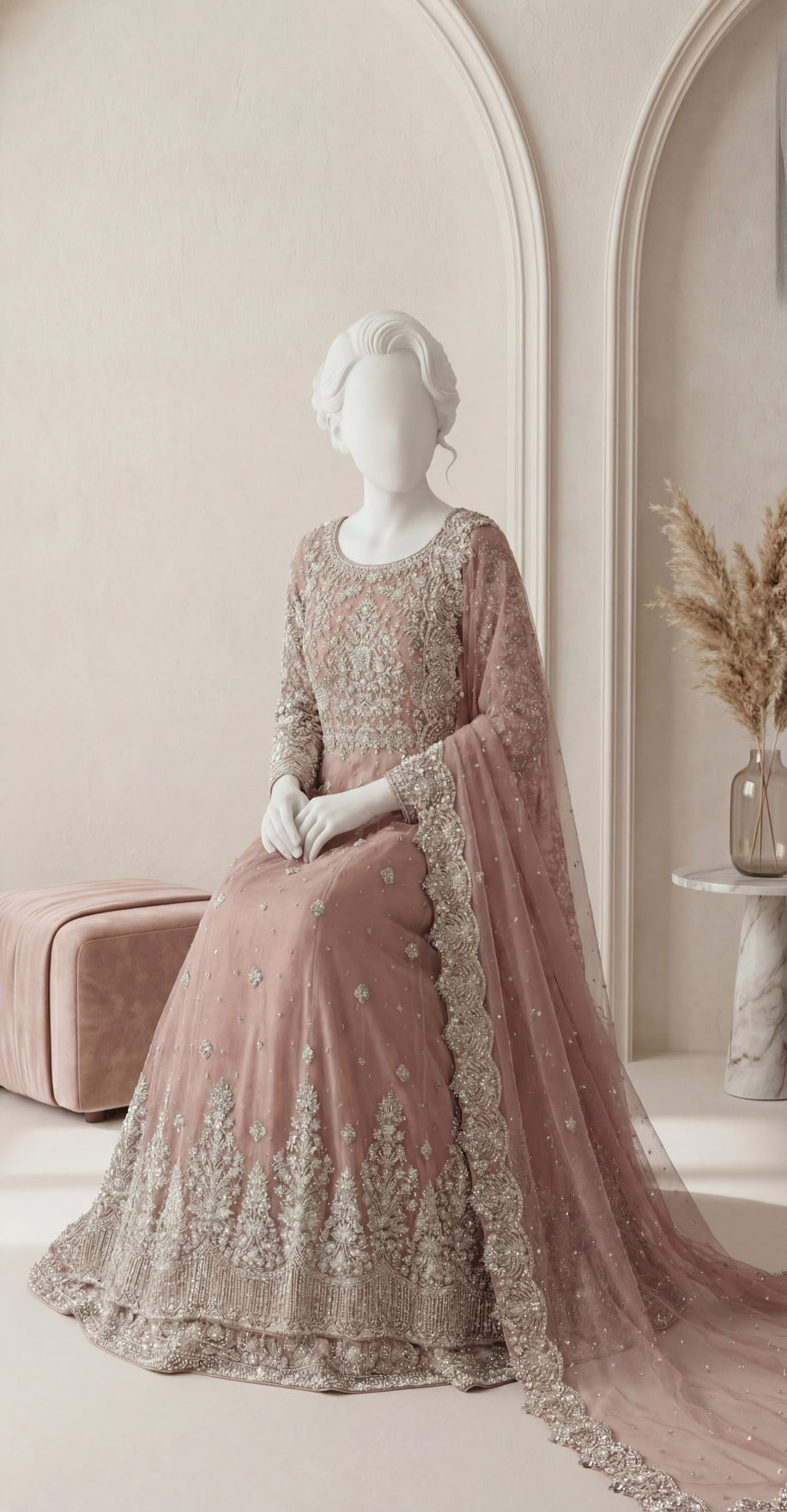 This pink maxi is a graceful expression of soft elegance and timeless craftsmanship. Crafted from delicate net fabric, the flowing silhouette is adorned with pure hand-made Zardozi work, creating a refined and feminine look—perfect for weddings, festive occasions, and formal gatherings.