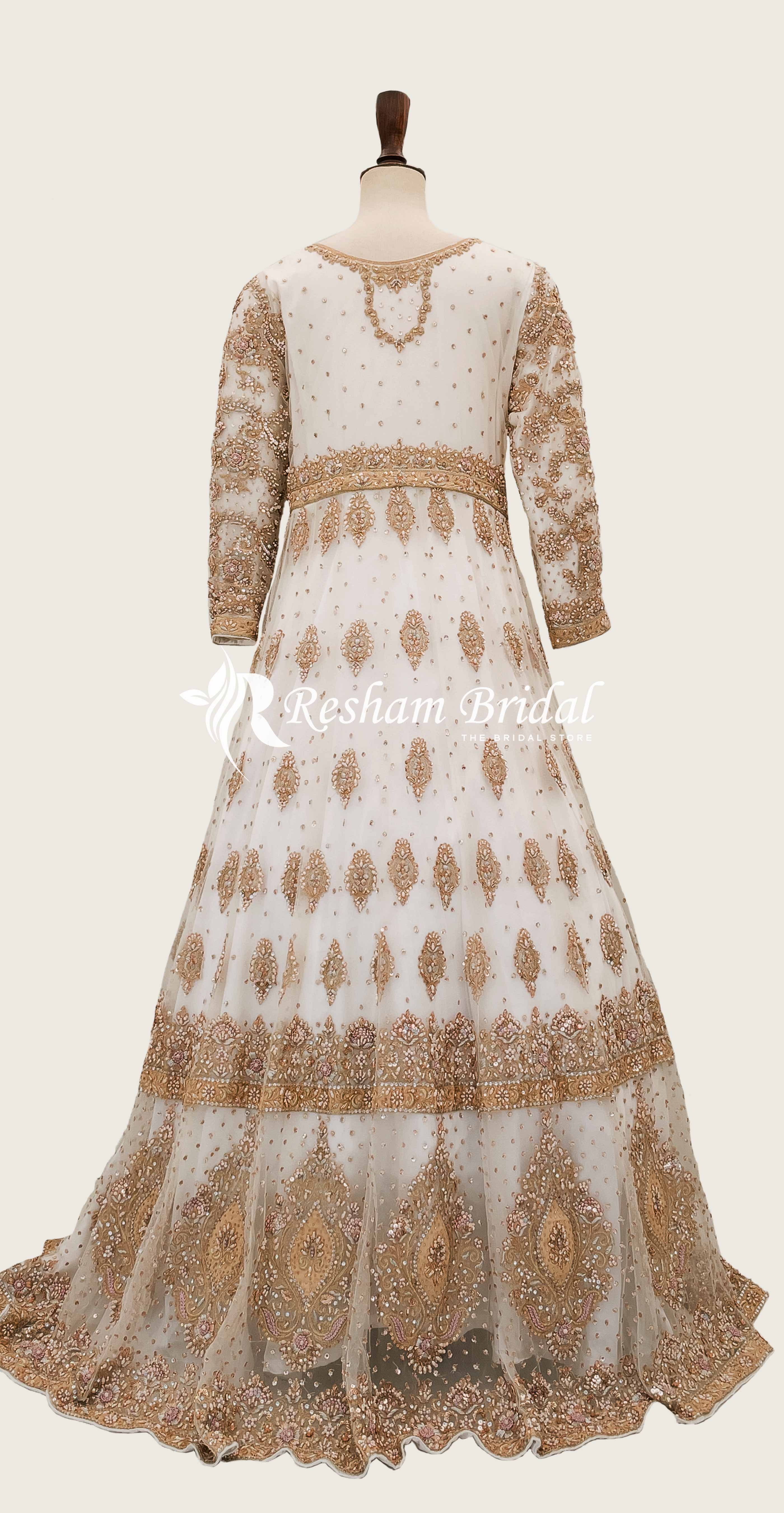Work: Mostly hand embellishments with a touch of machine work using sitara, kora, dapka, and zari.