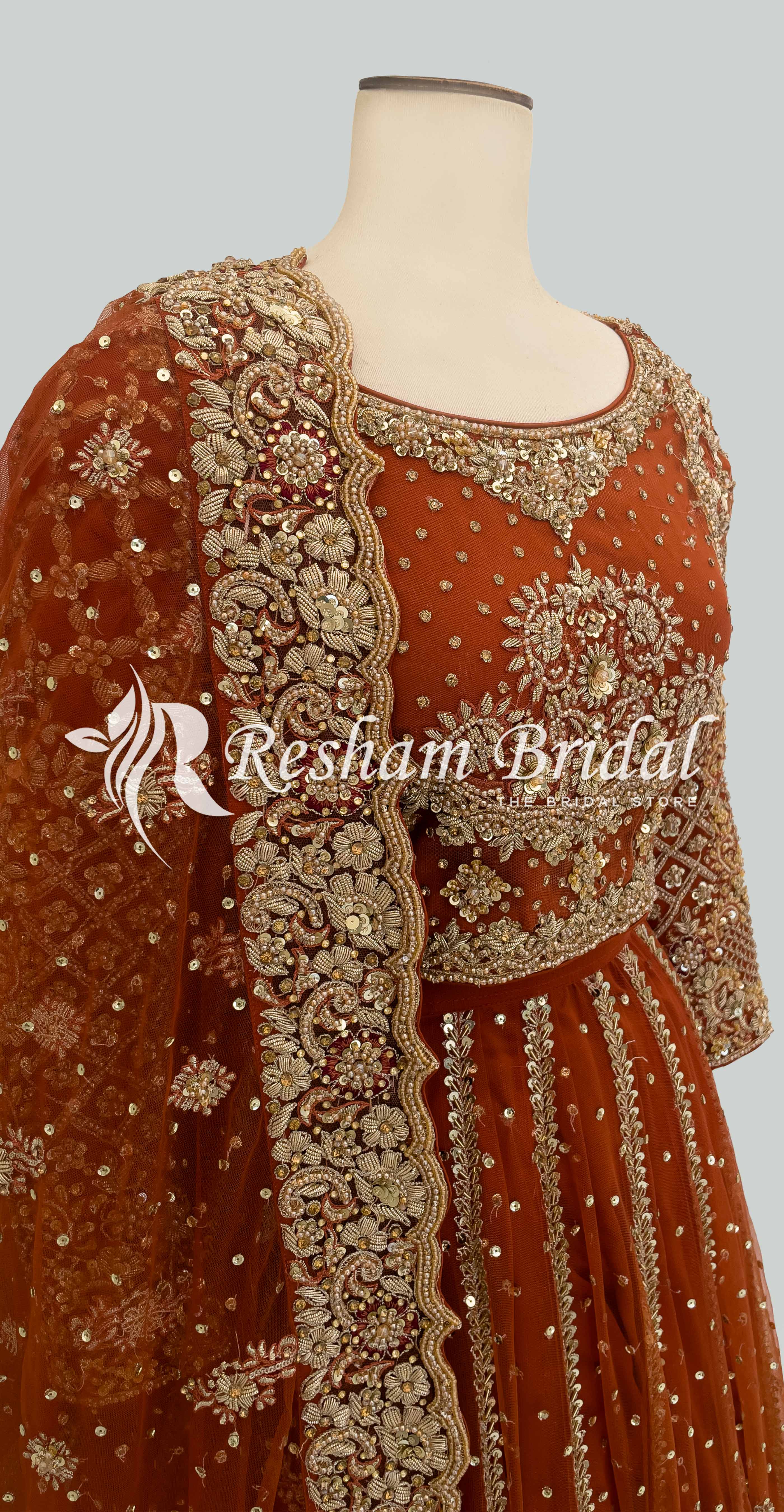 Description: This bridal farshi is adorned with exquisite hand work qoura dapka Traditional kacha antique work embellishments such as intricate zardozi and sharara heavy chan fillings