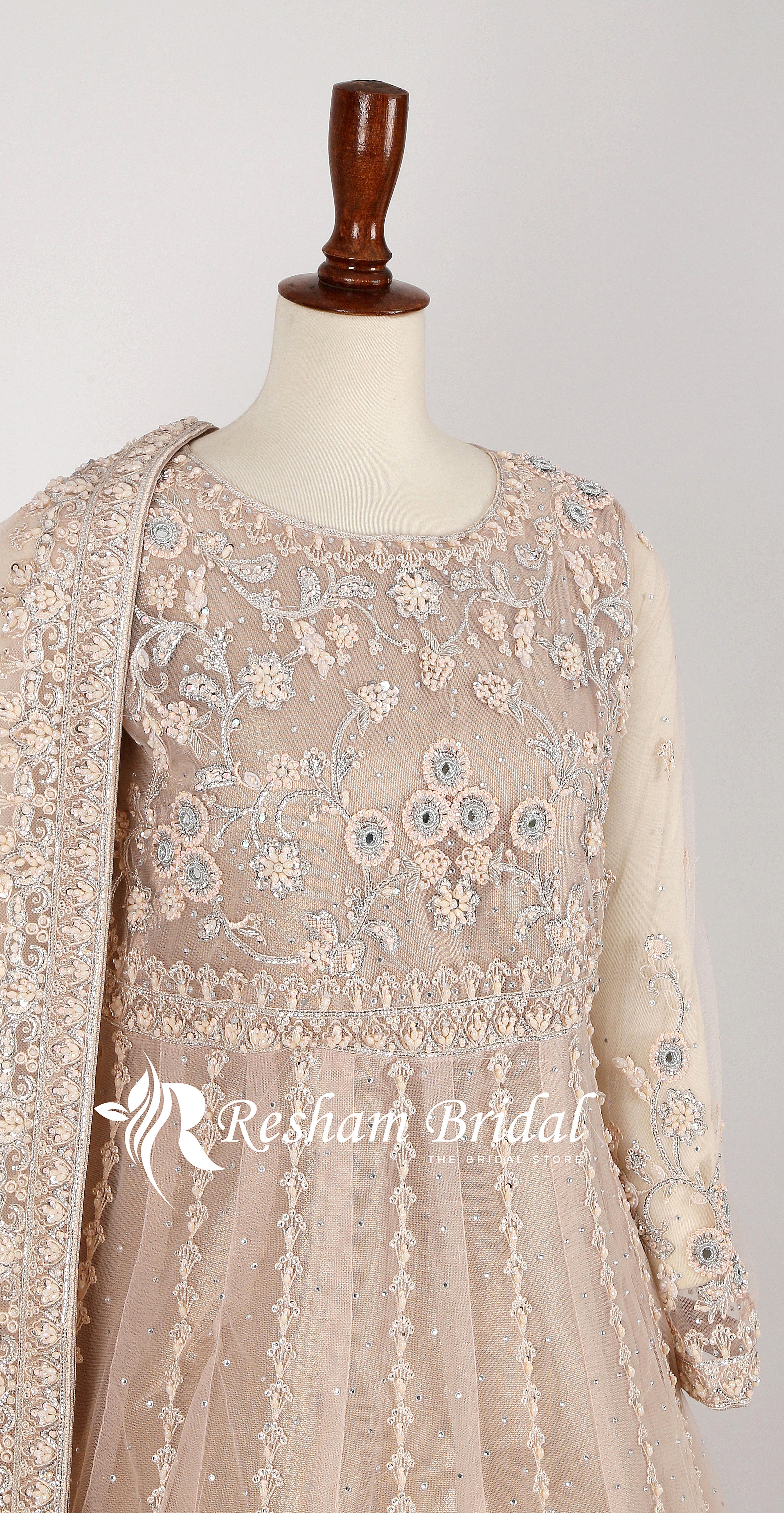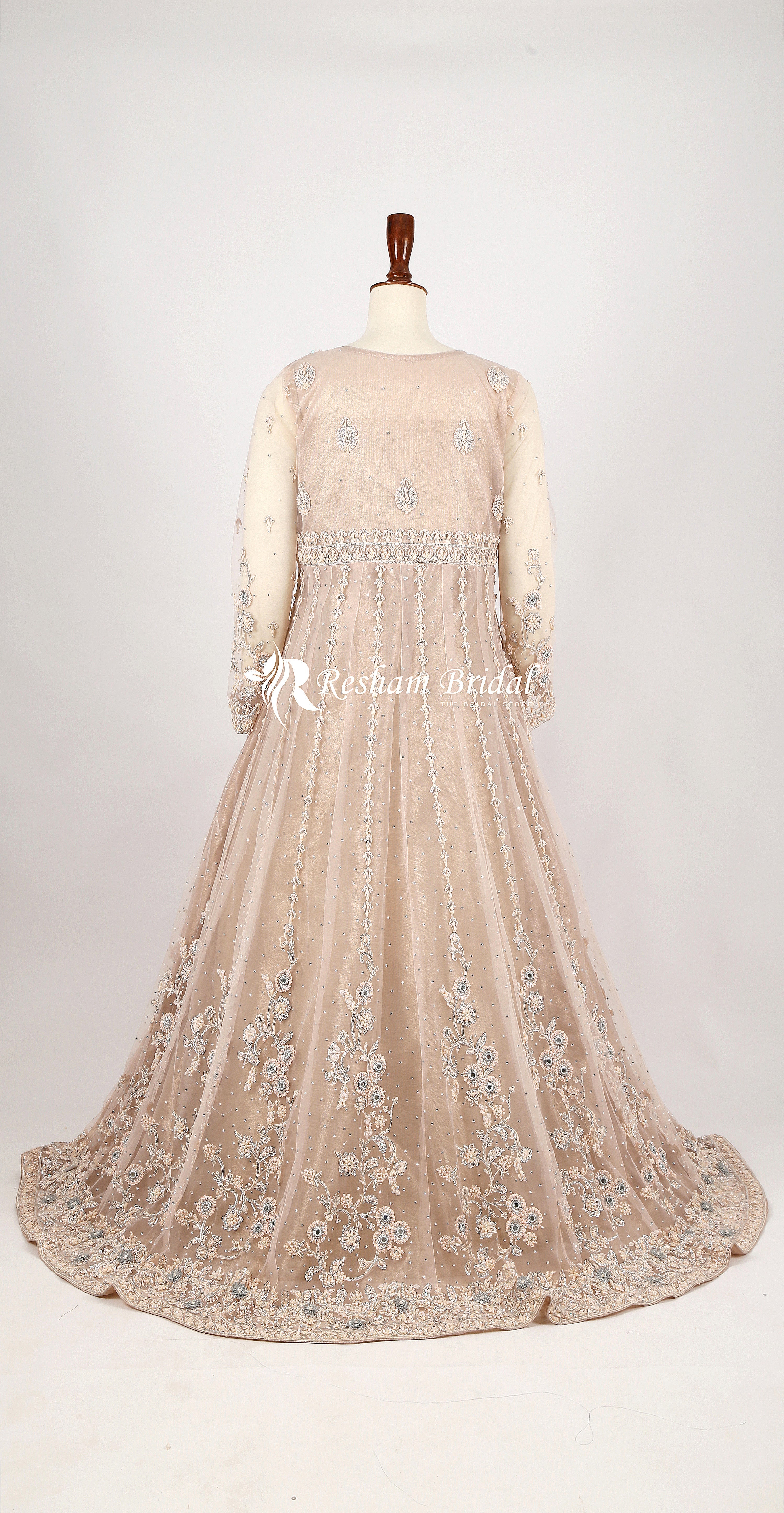 Description: The net maxi and Dupatta is adorned with exquisite hand and machine embroidery. Traditional embellishments such as intricate kora, zari, pearls and stones.