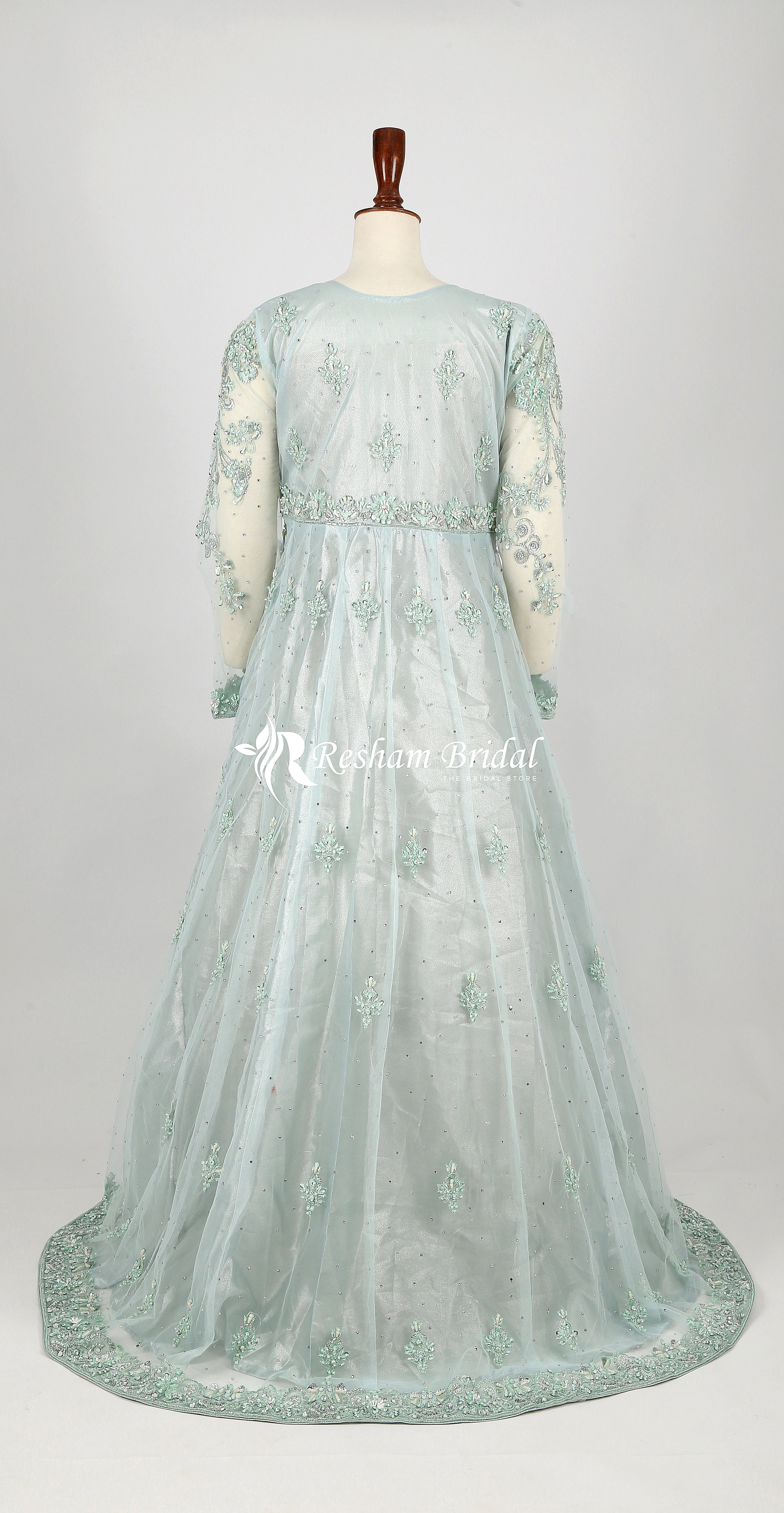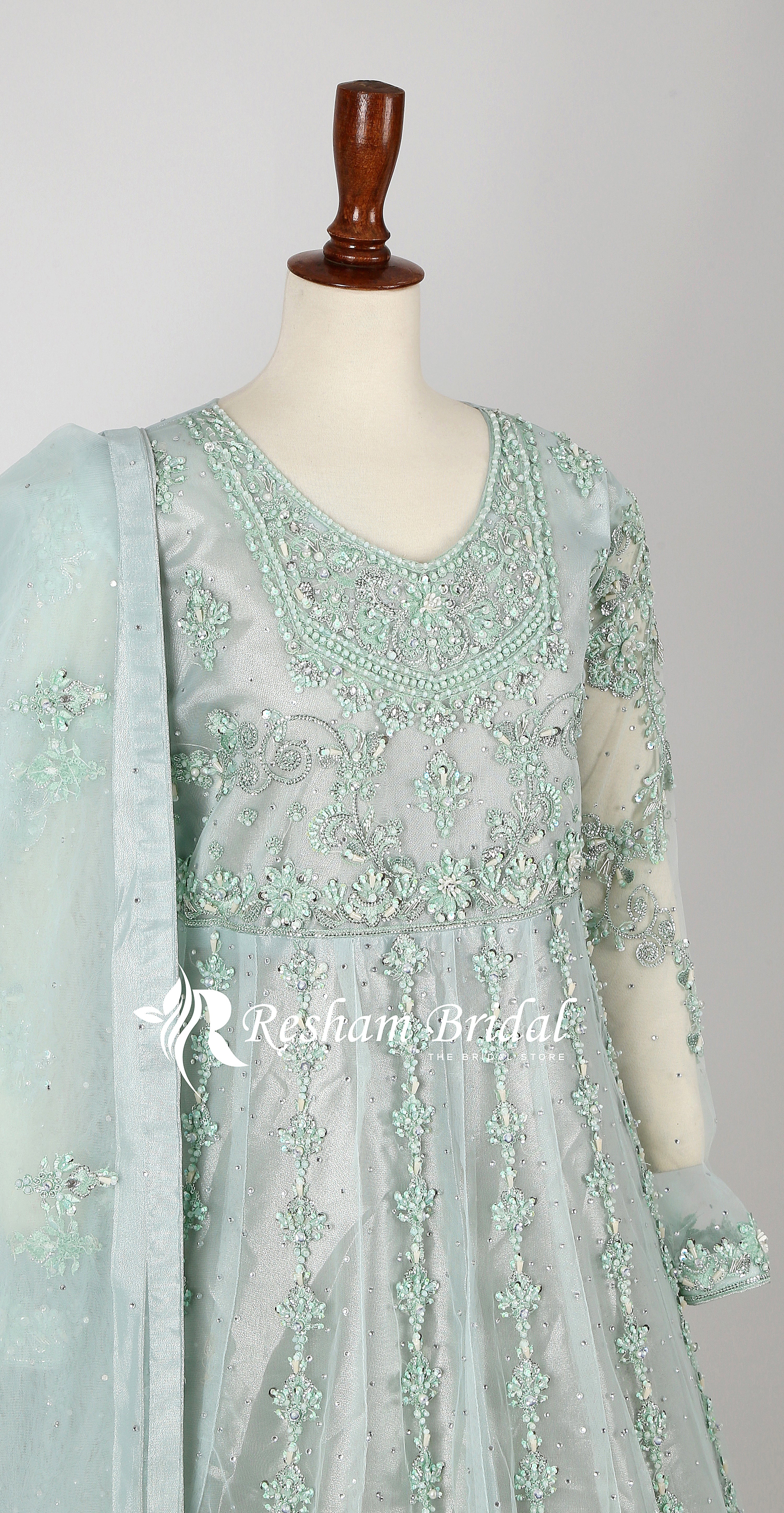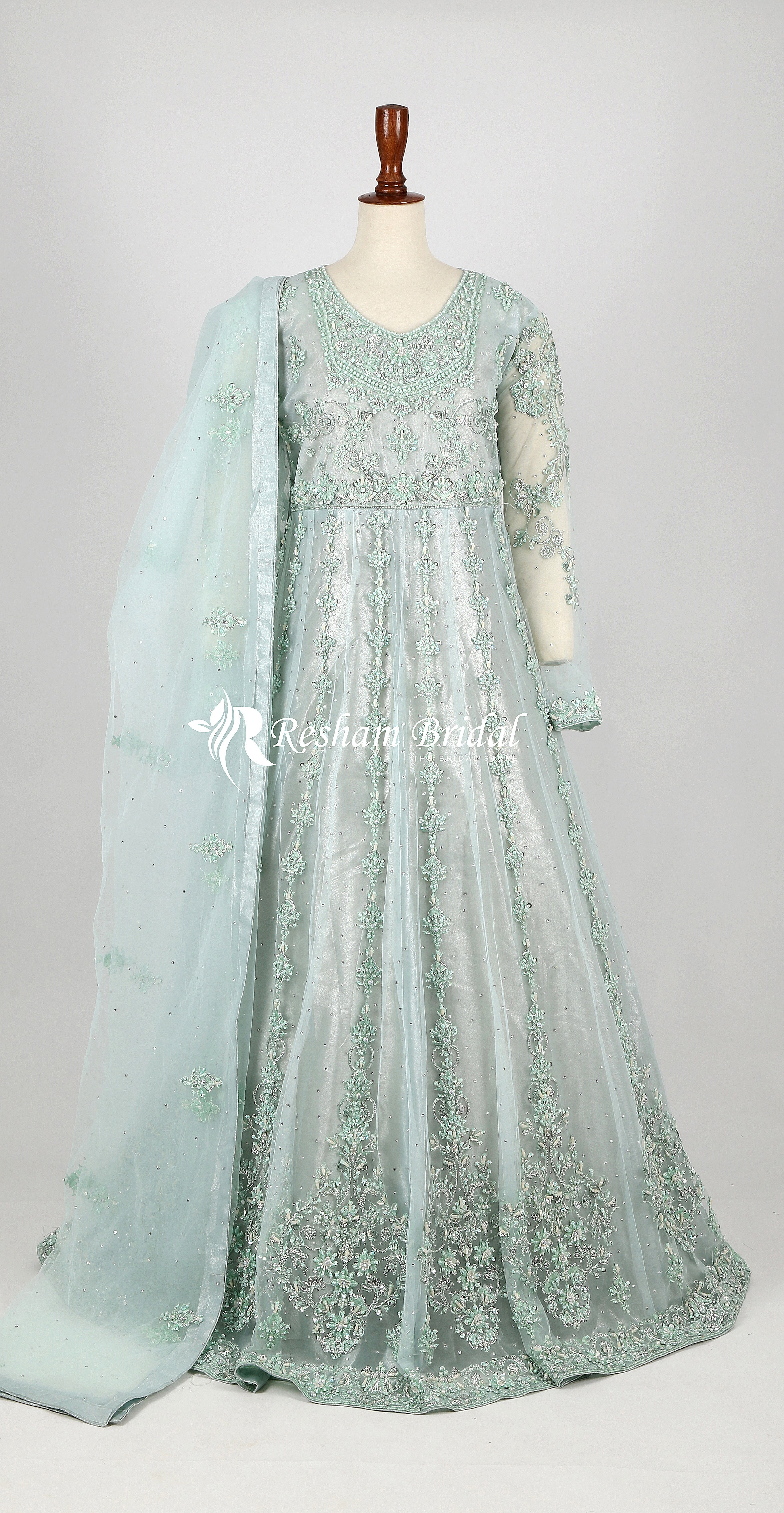 Description: The net maxi and Dupatta is adorned with exquisite hand and machine embroidery. Traditional embellishments such as intricate kora, zari, pearls and stones.