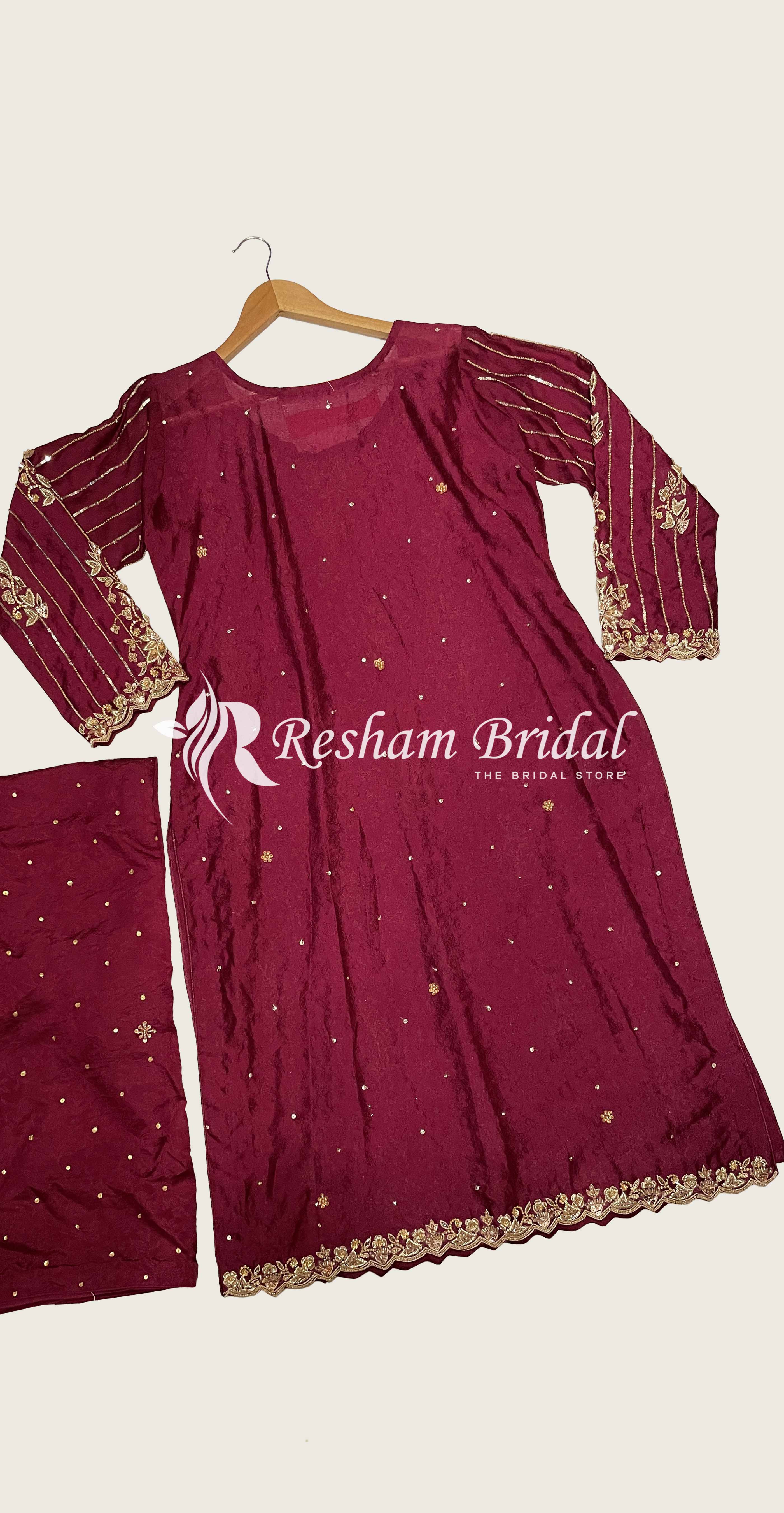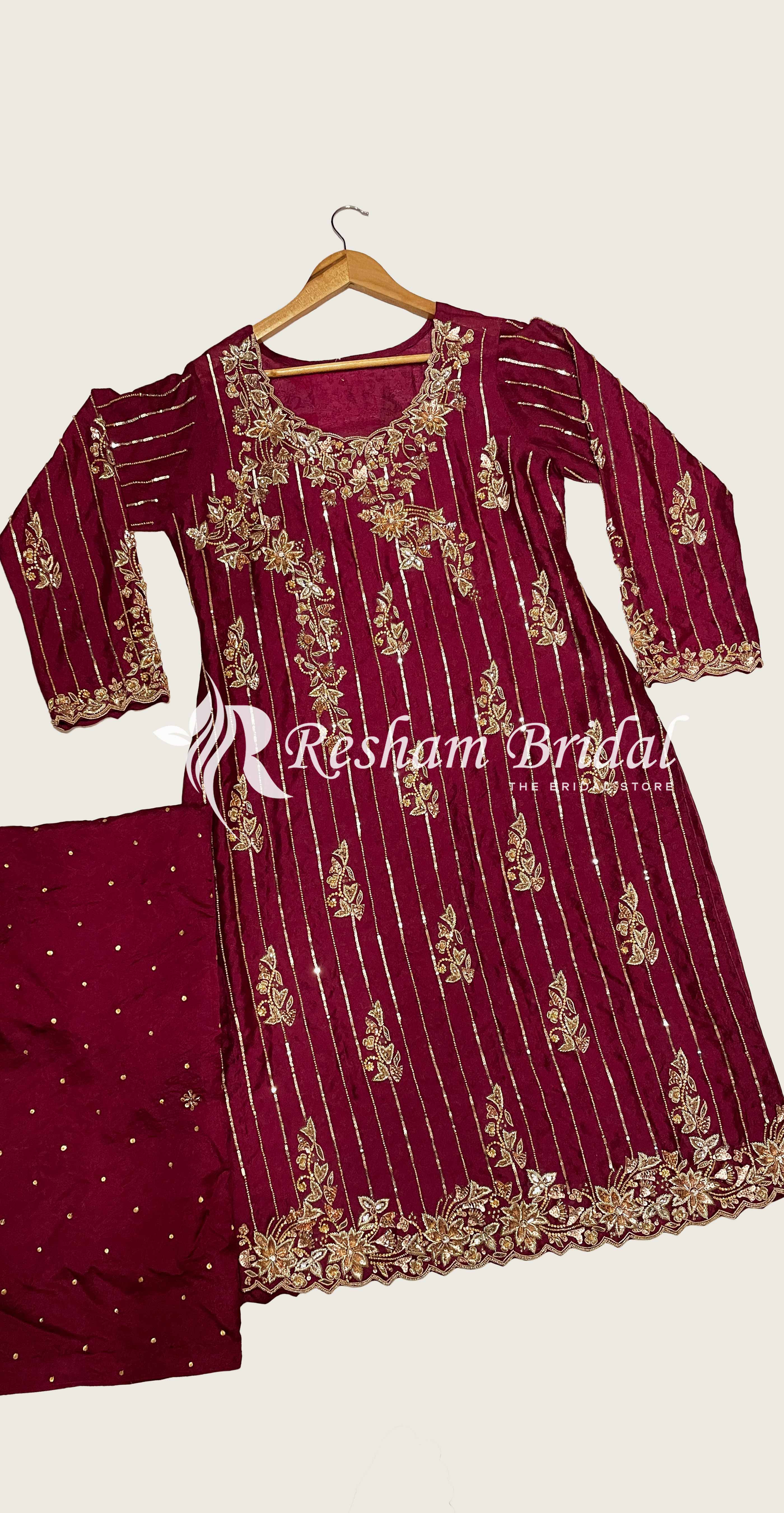 Description: The Sheesha silk shirt is adorned with exquisite hand embroidery. Traditional embellishments such as intricate kora,zari, pearls, and stones.