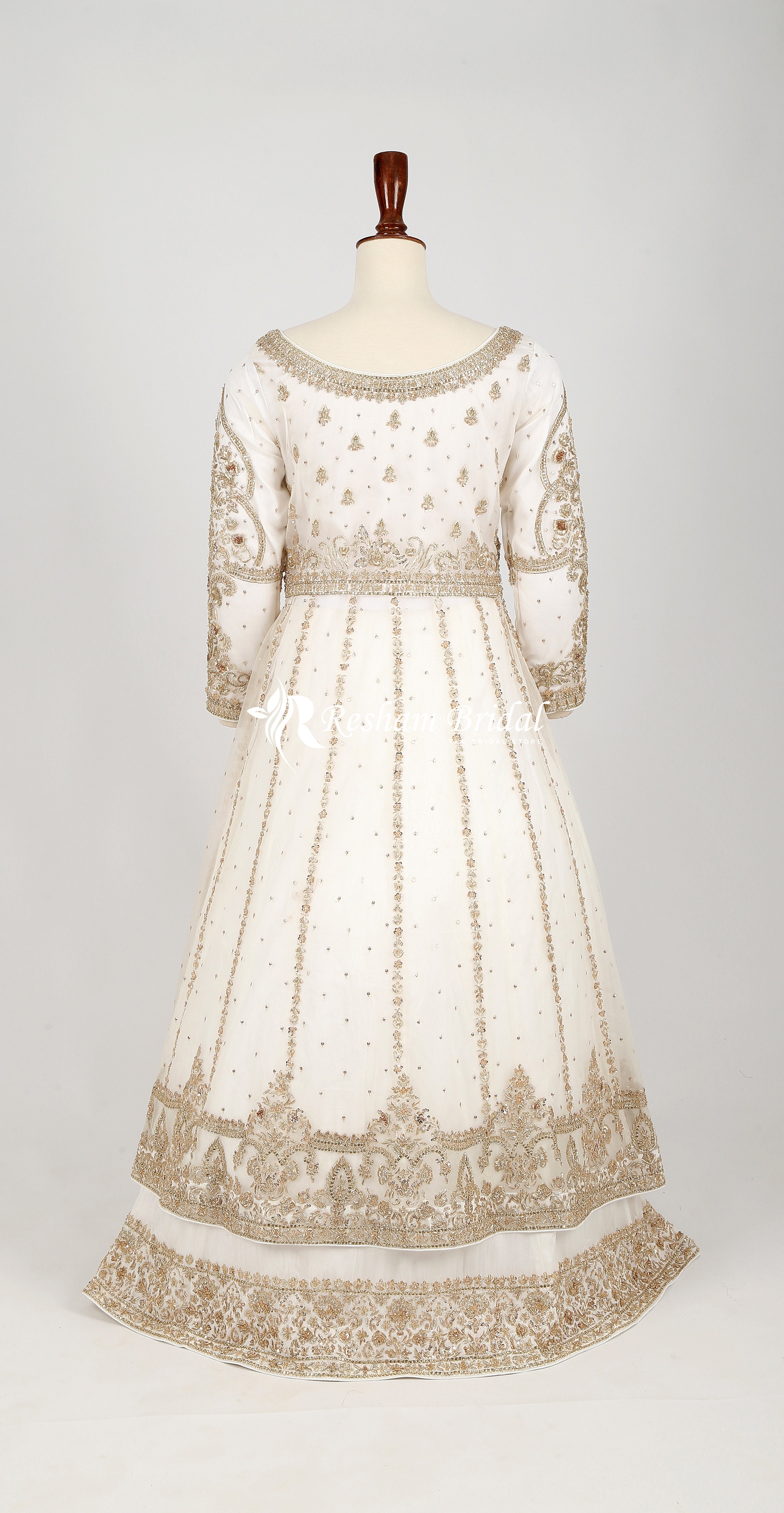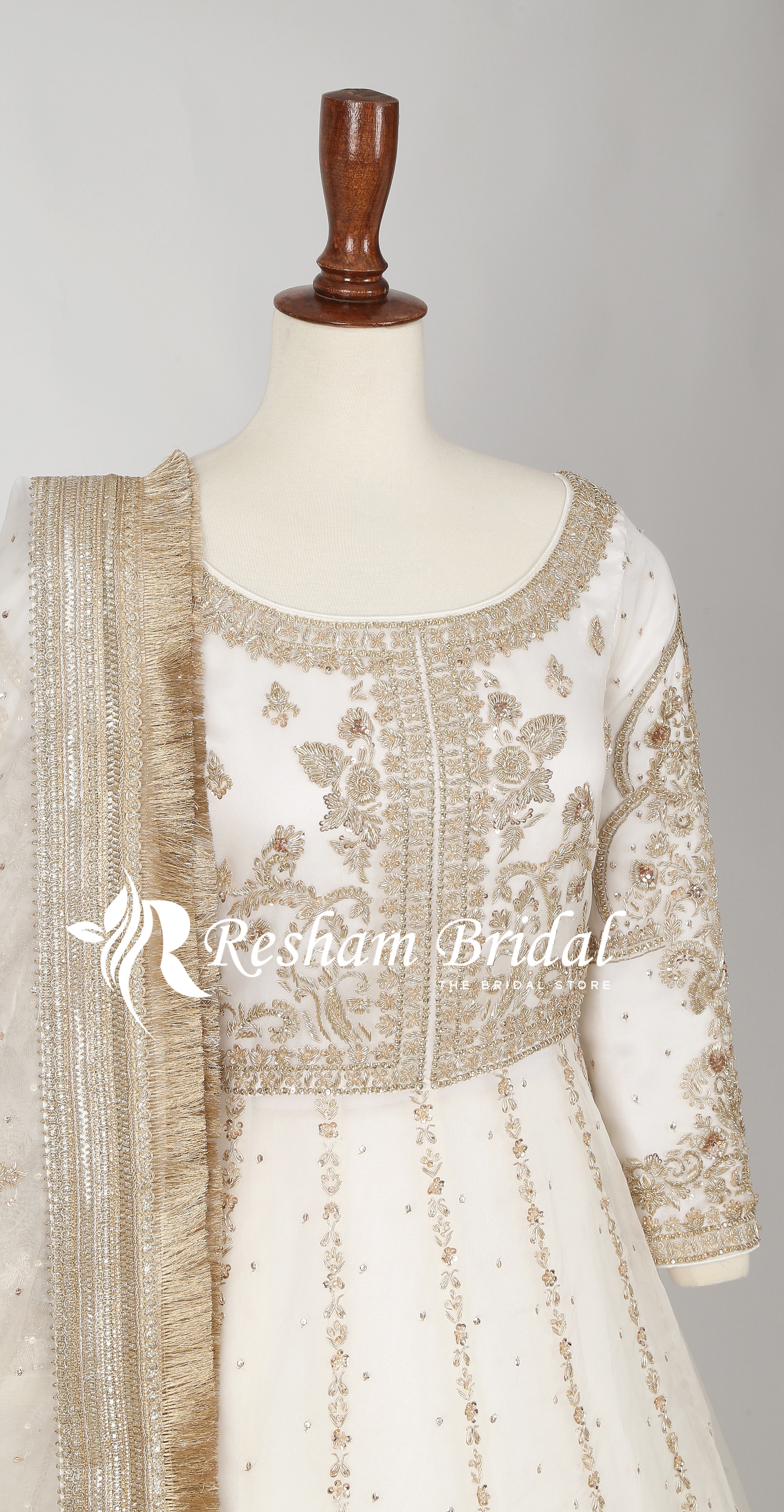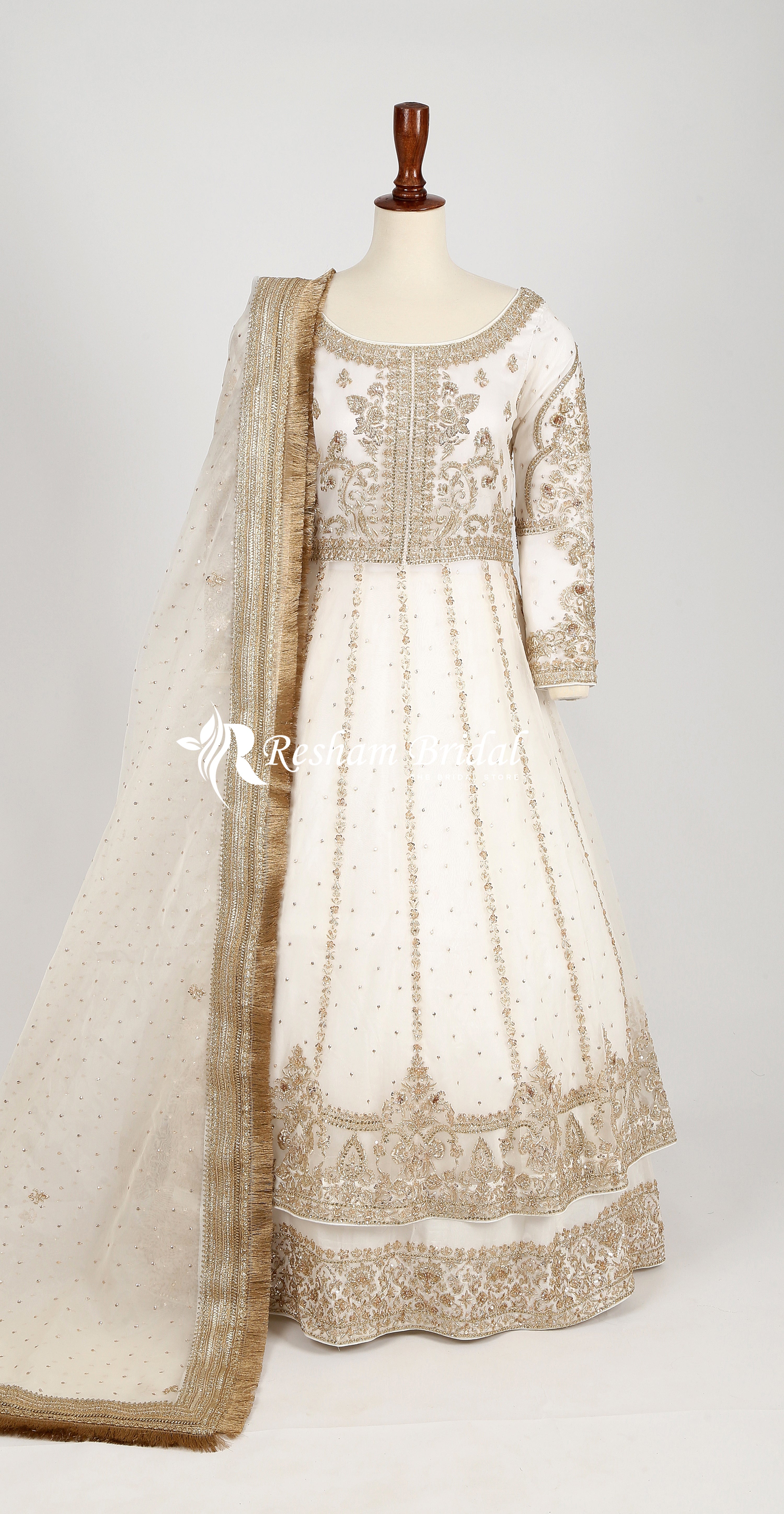 Description: This bridal Maxi is adorned with exquisite hand work qoura dapka Traditional kacha MATTE GOLD work embellishments such as intricate zardozi and sharara