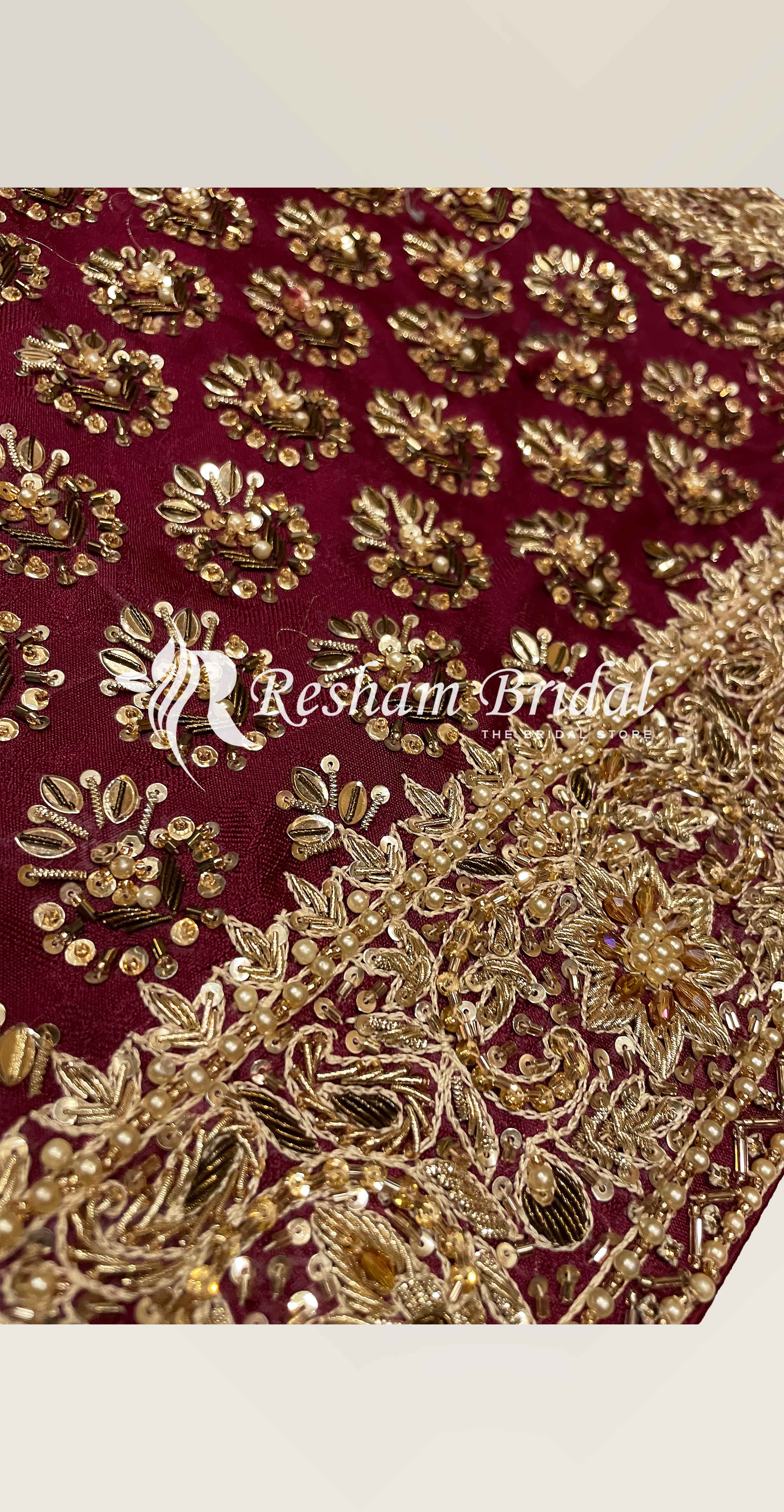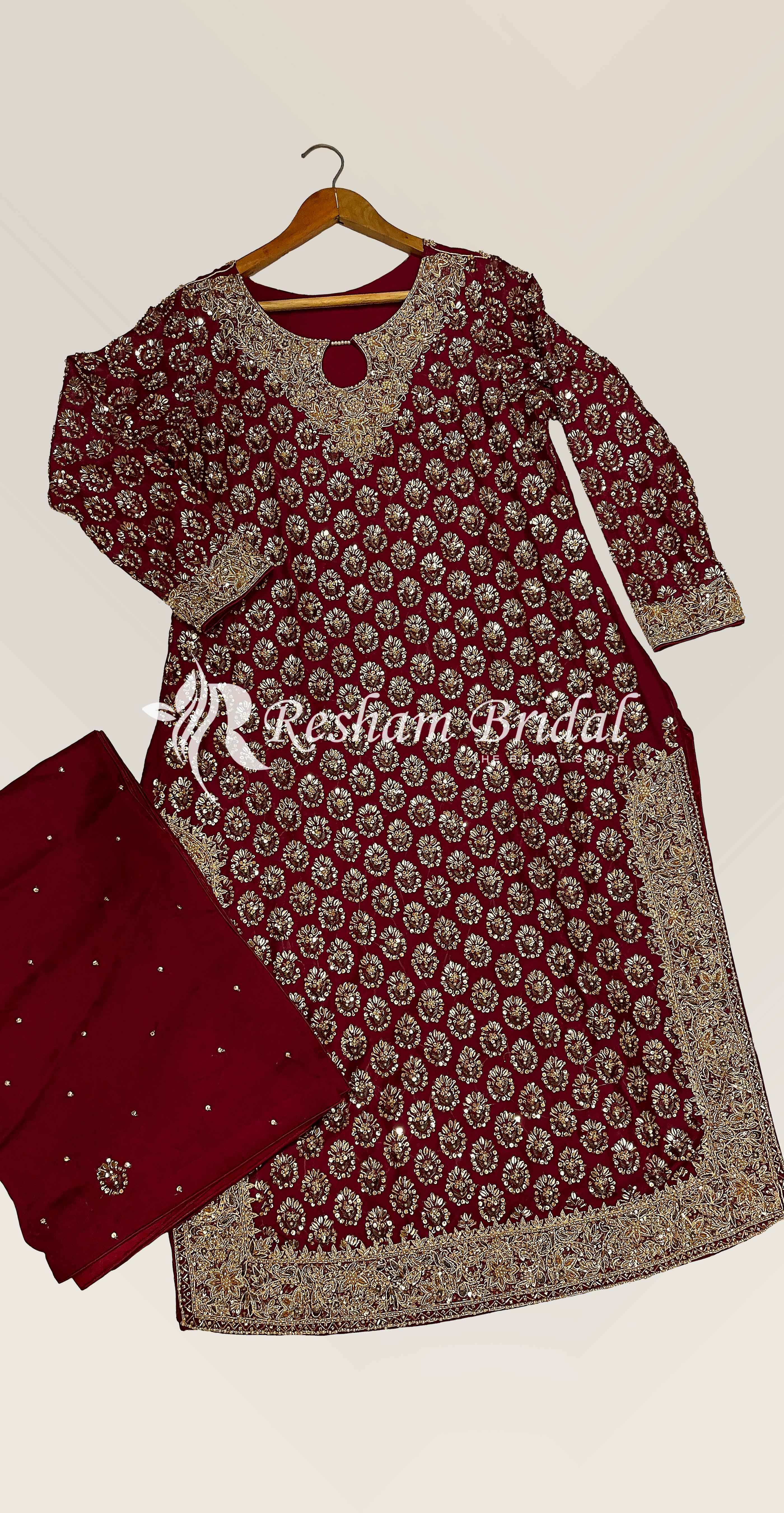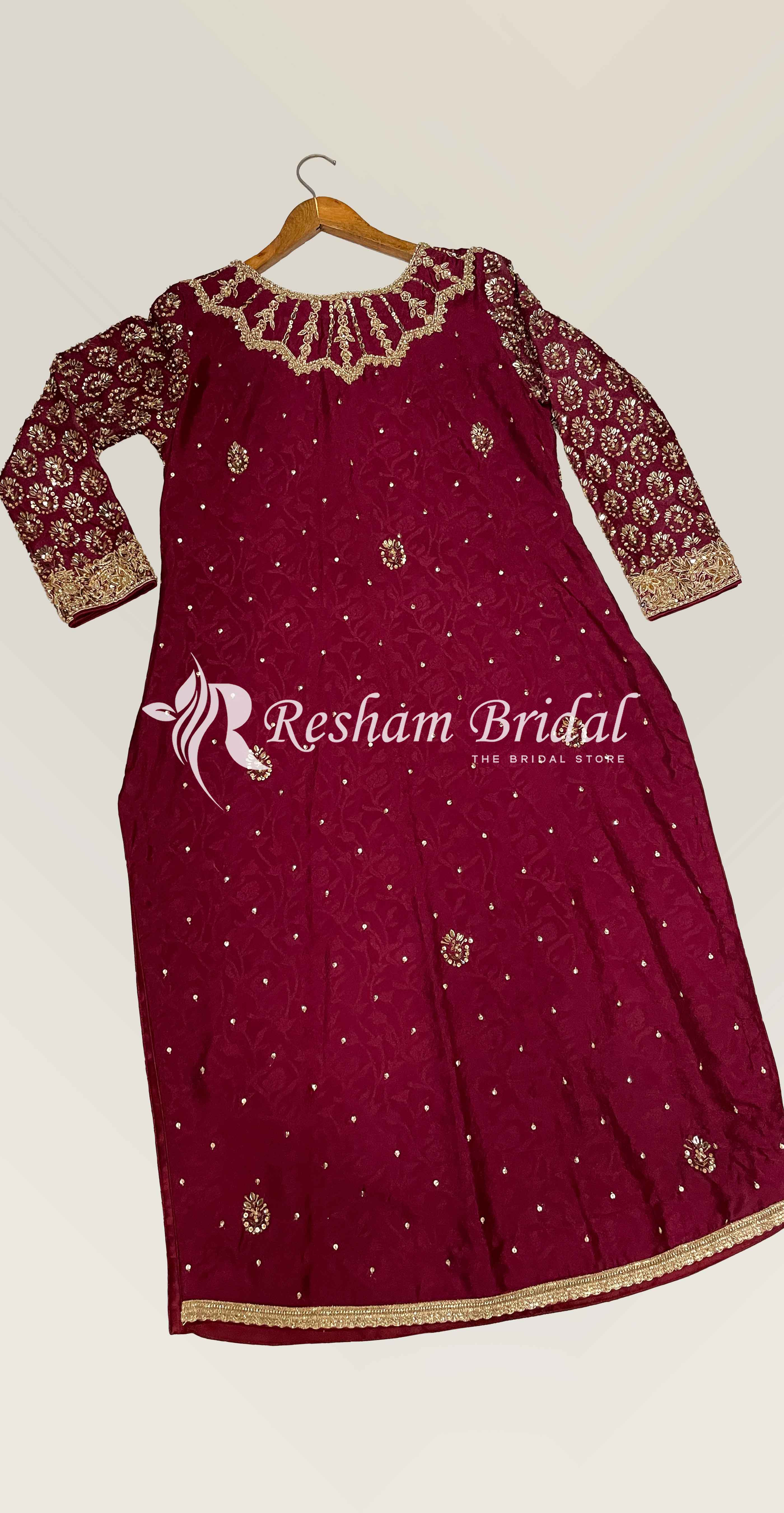 Description: The sheesha silk shirt and dupatta are adorned with exqusite hand embroidery. Traditional embellishments such as intricate ,kacha,stones,sitara,kora and dapka.