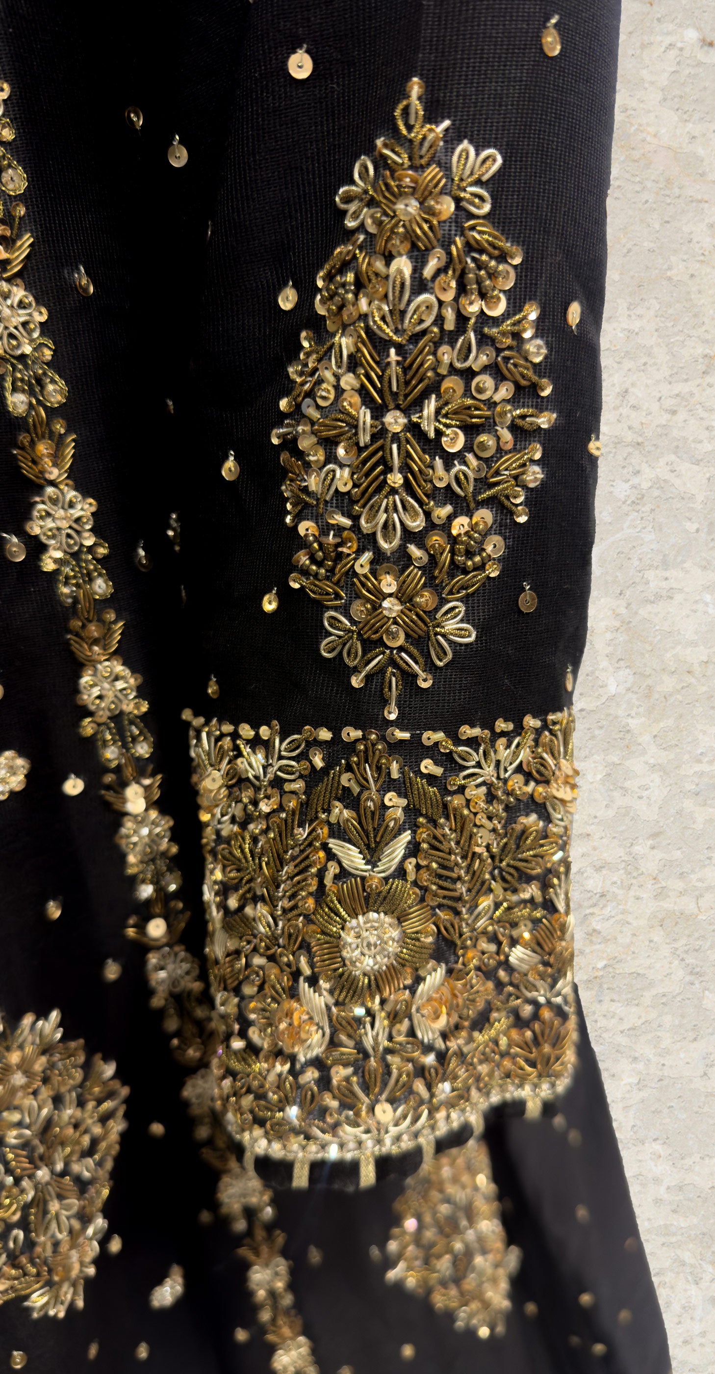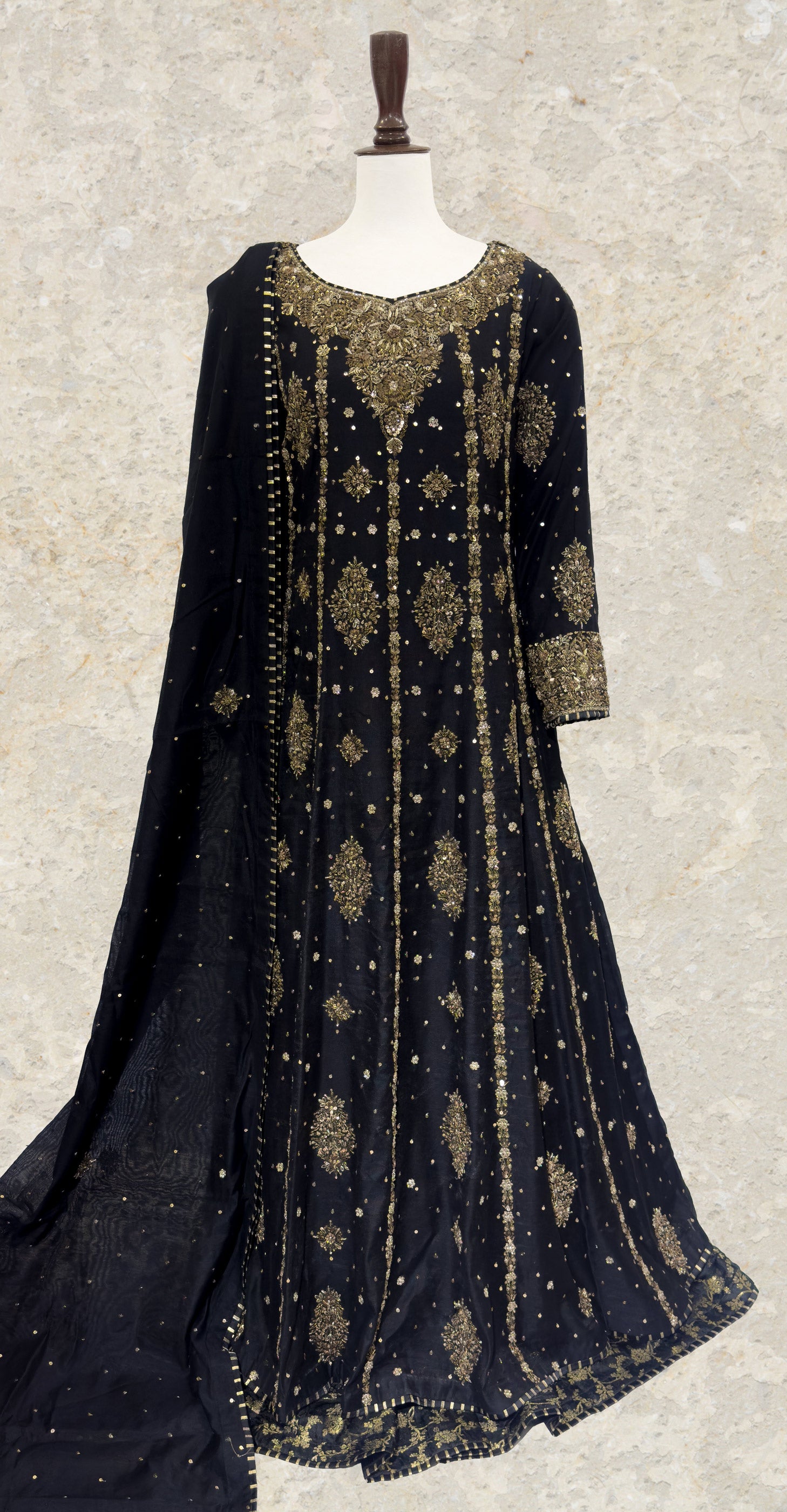 This elegant black maxi is crafted from premium cotton net, giving it a soft, airy flow with a refined, graceful appearance. The outfit is intricately embellished with pure handmade Zardozi Kacha work, showcasing traditional craftsmanship and detailed artistry. The classic black color adds sophistication and timeless charm, making this maxi a perfect choice for weddings, festive events, and formal occasions.