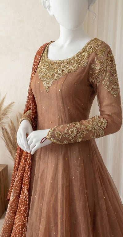 This light pink maxi embodies soft elegance and timeless beauty, designed to create a graceful and feminine statement. Crafted from delicate net fabric, the flowing silhouette is adorned with intricate Zardozi work enhanced by stone, zari, and pearl embellishments, adding a subtle shimmer and refined charm—perfect for festive and formal occasions.