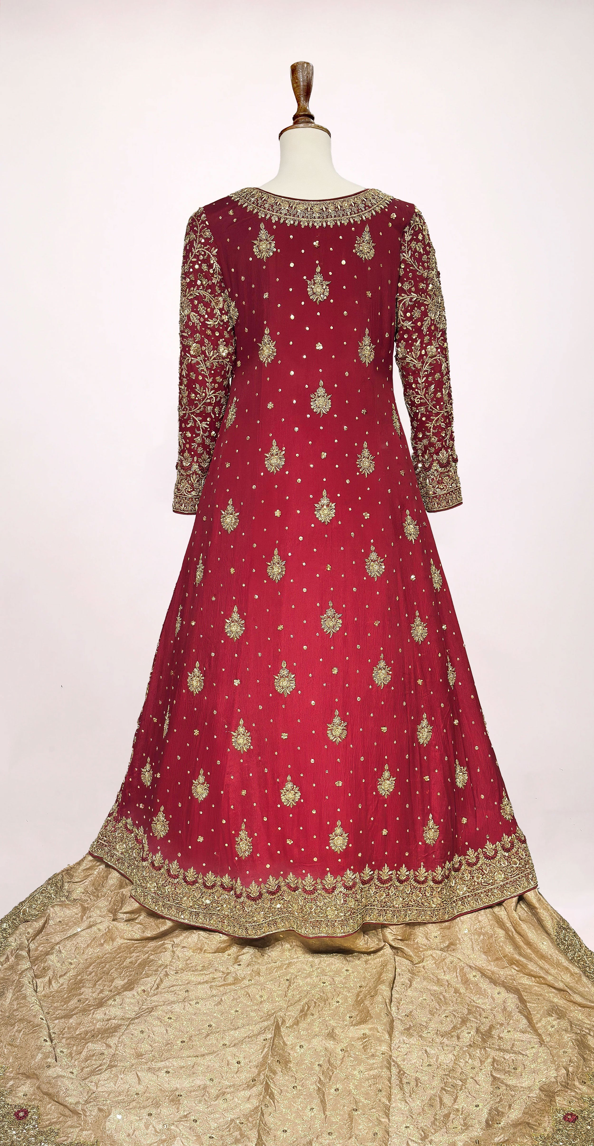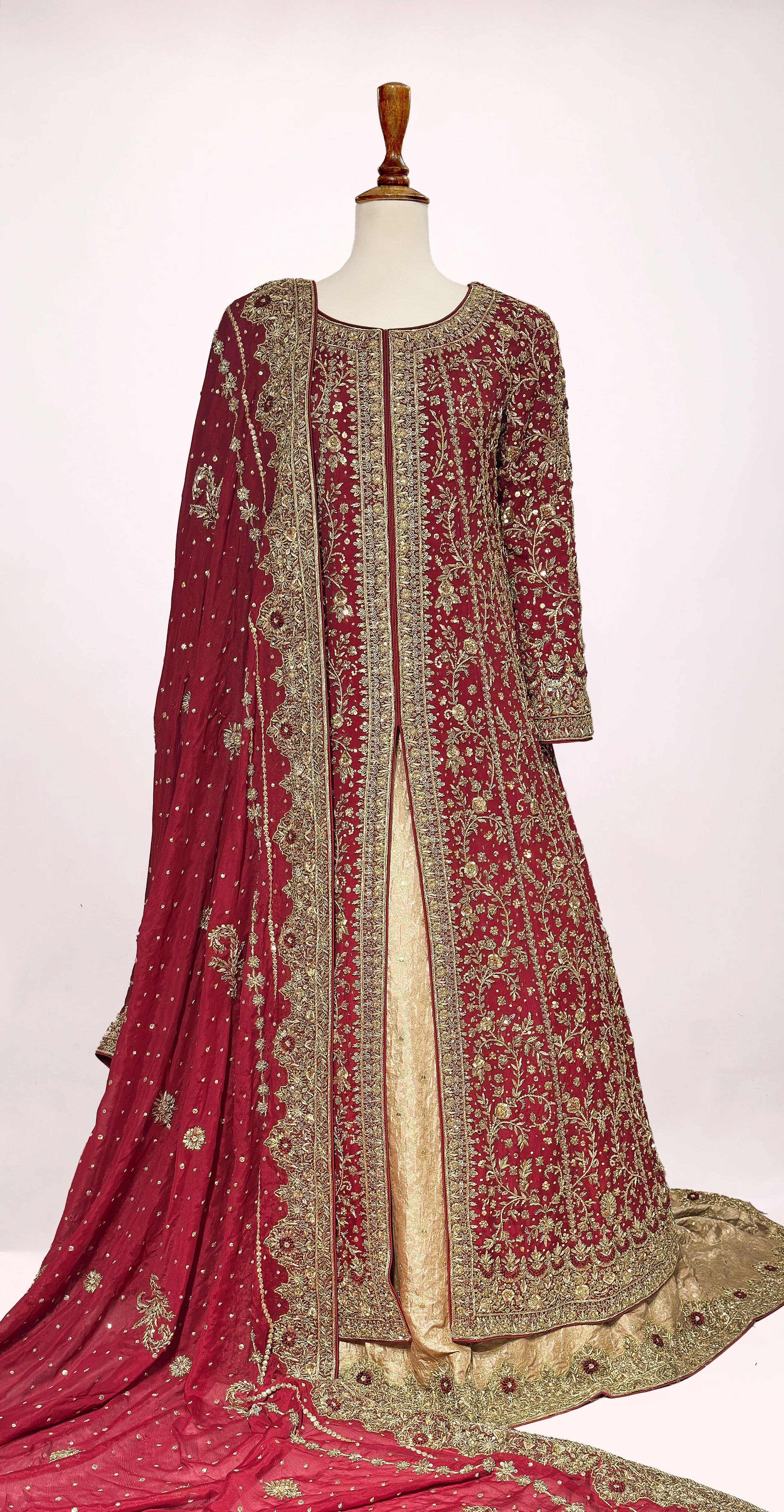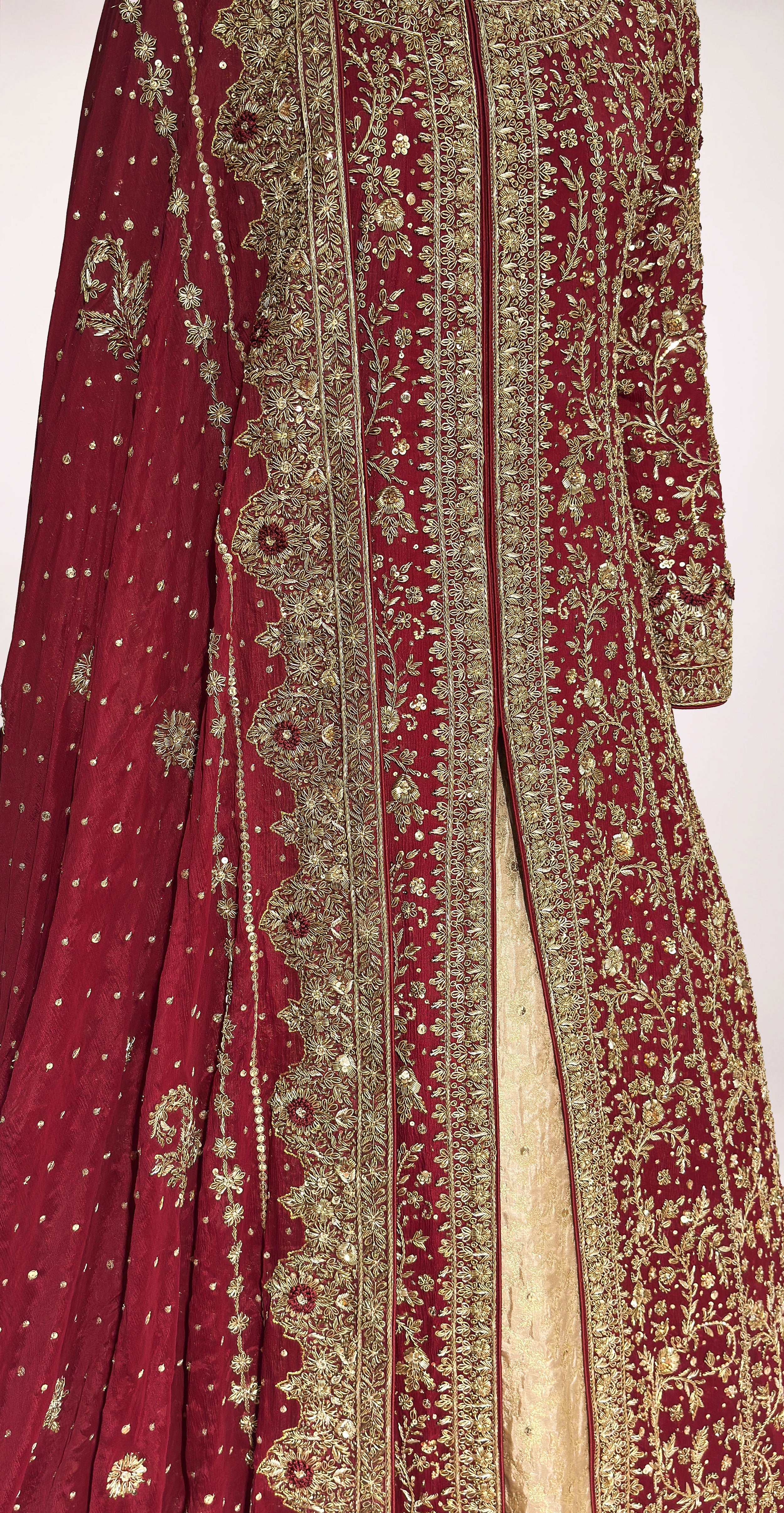 Description: This bridal open farshi is adorned with exquisite hand work qoura dapka Traditional kacha antique work embellishments such as intricate zardozi and sharara heavy chan fillings