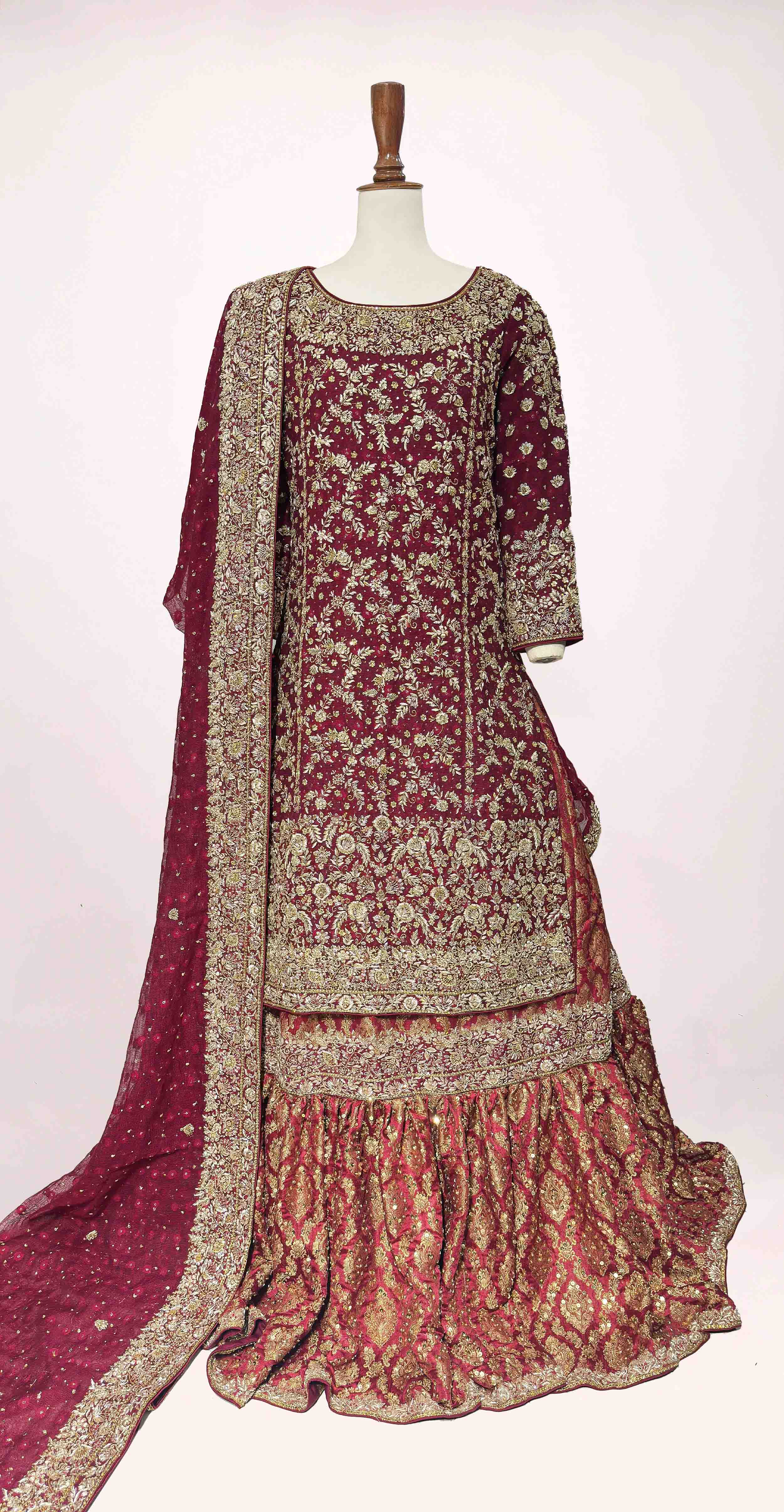 A matching dupatta, embellished with delicate scalloped edges, sequin accents, and a wide handworked border, completes the look—perfect for draping in a classic bridal style.