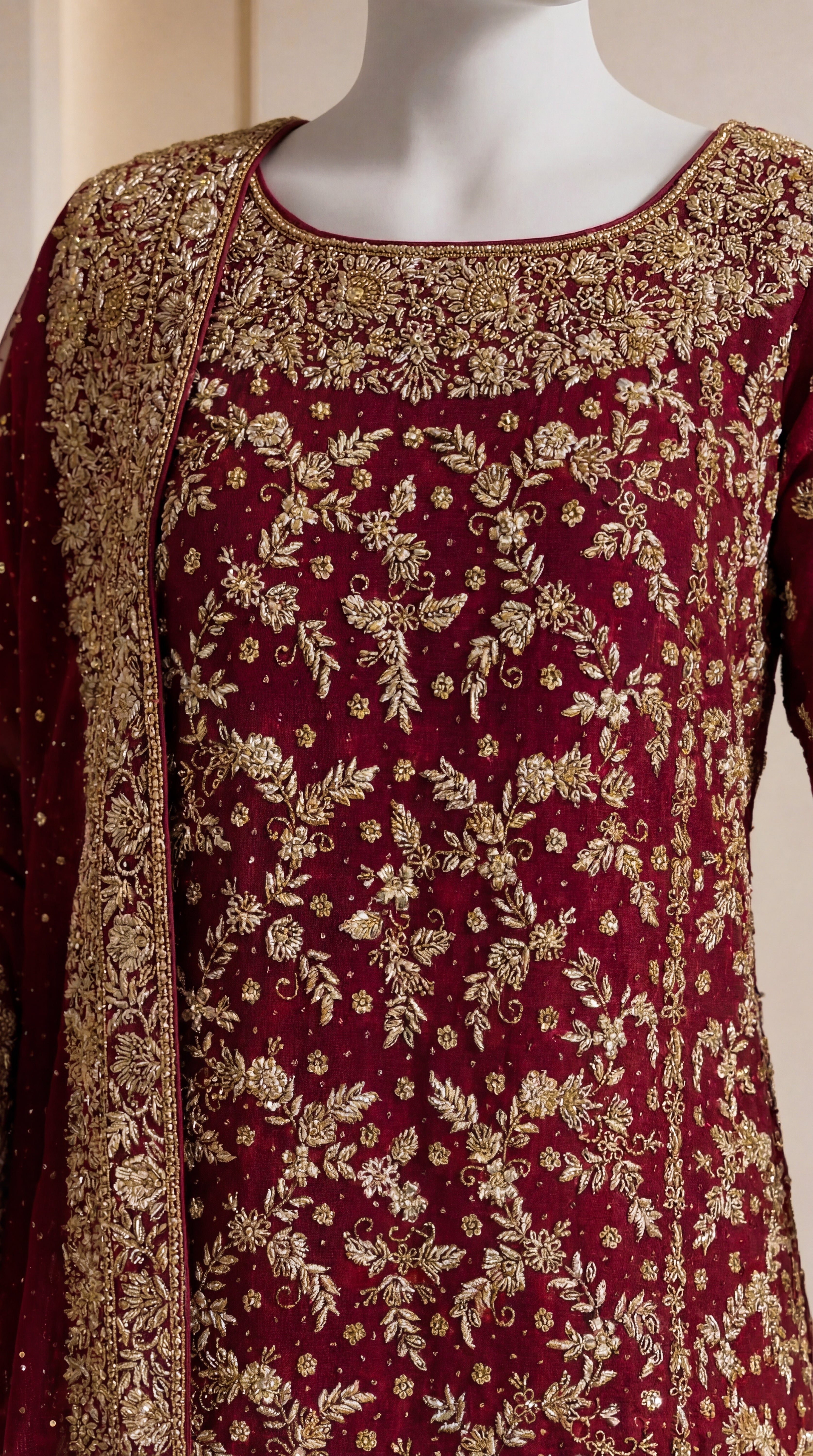 A royal fusion of handcrafted Zardozi artistry and timeless Farshi elegance.