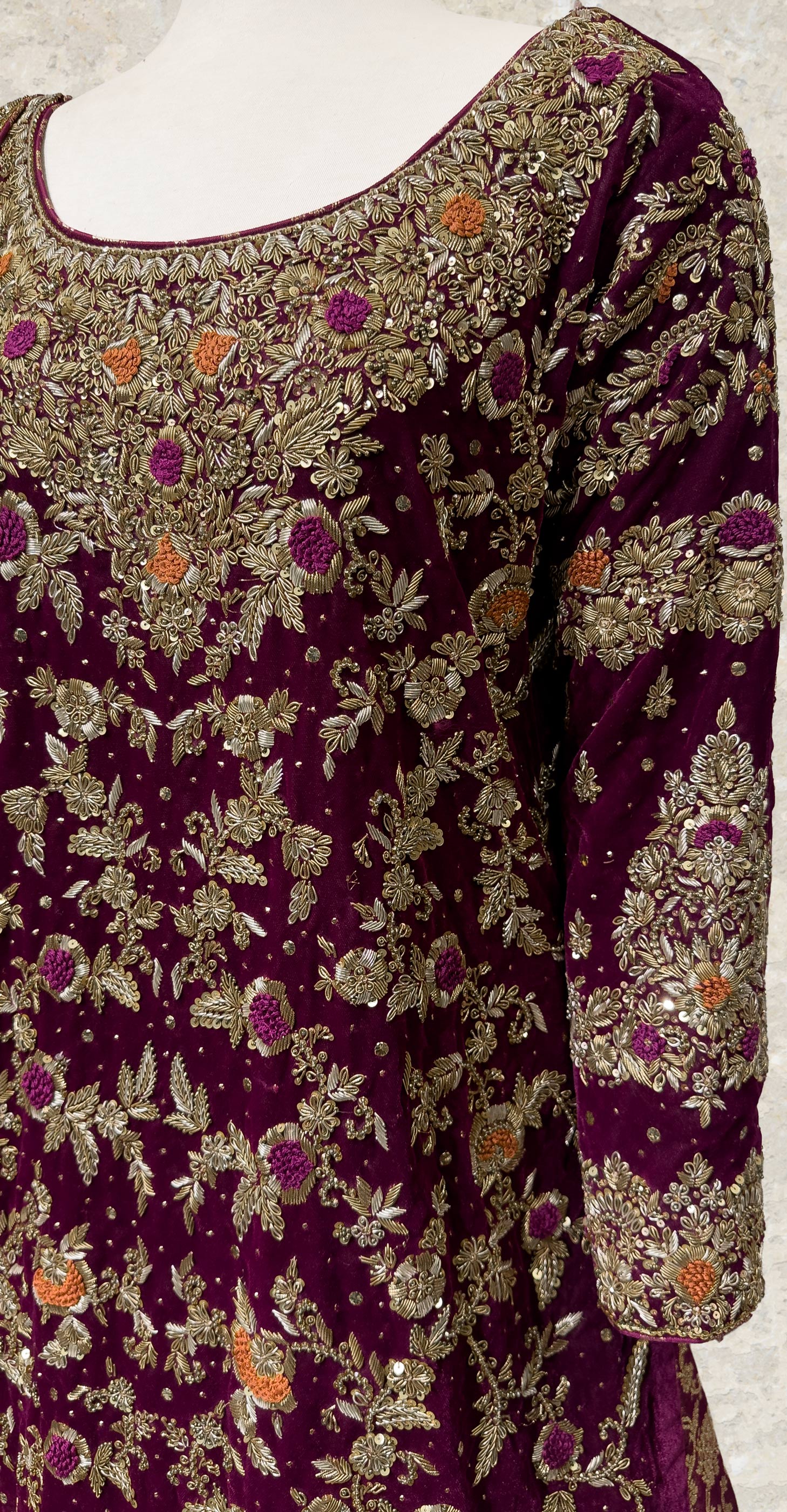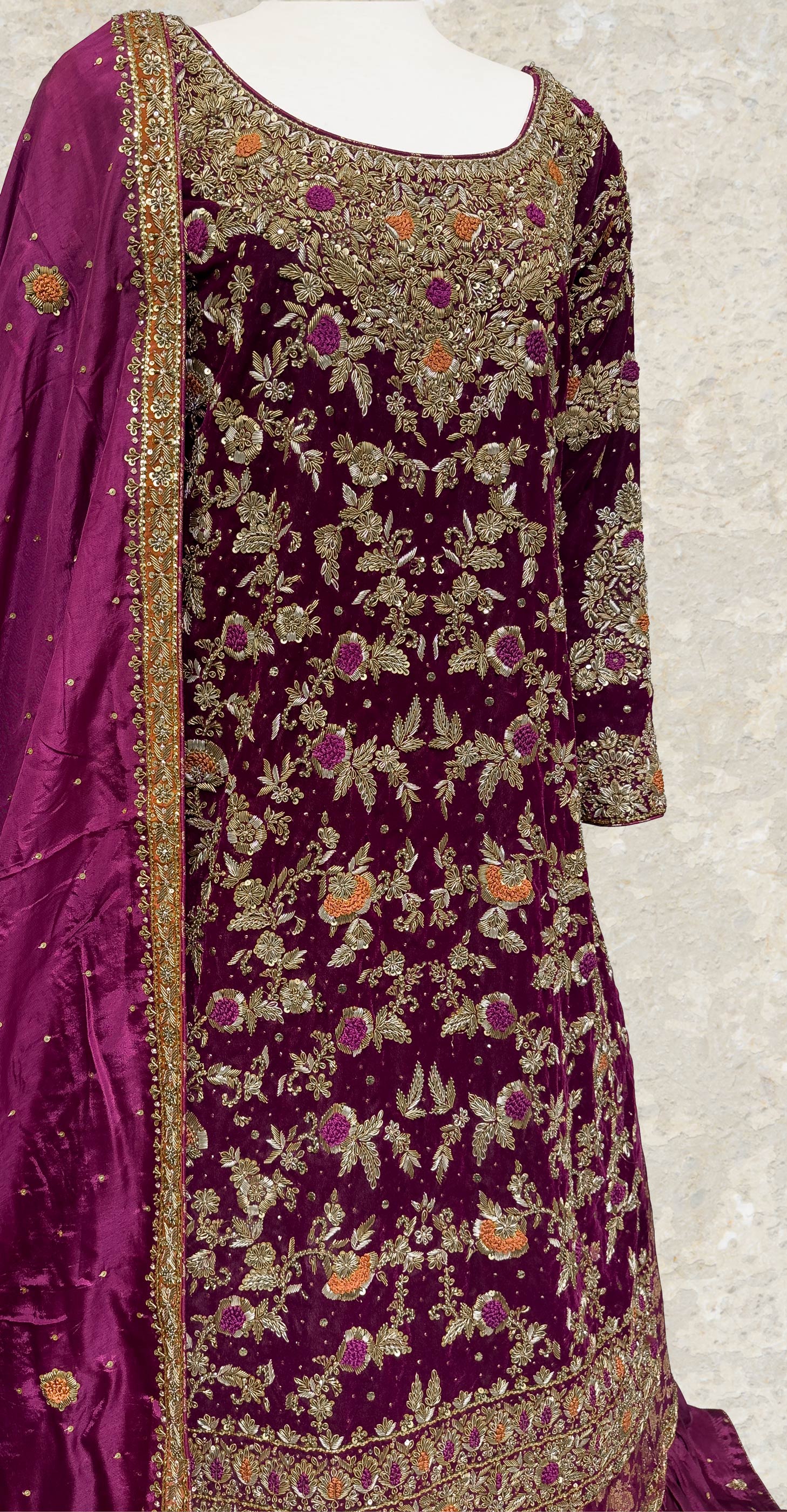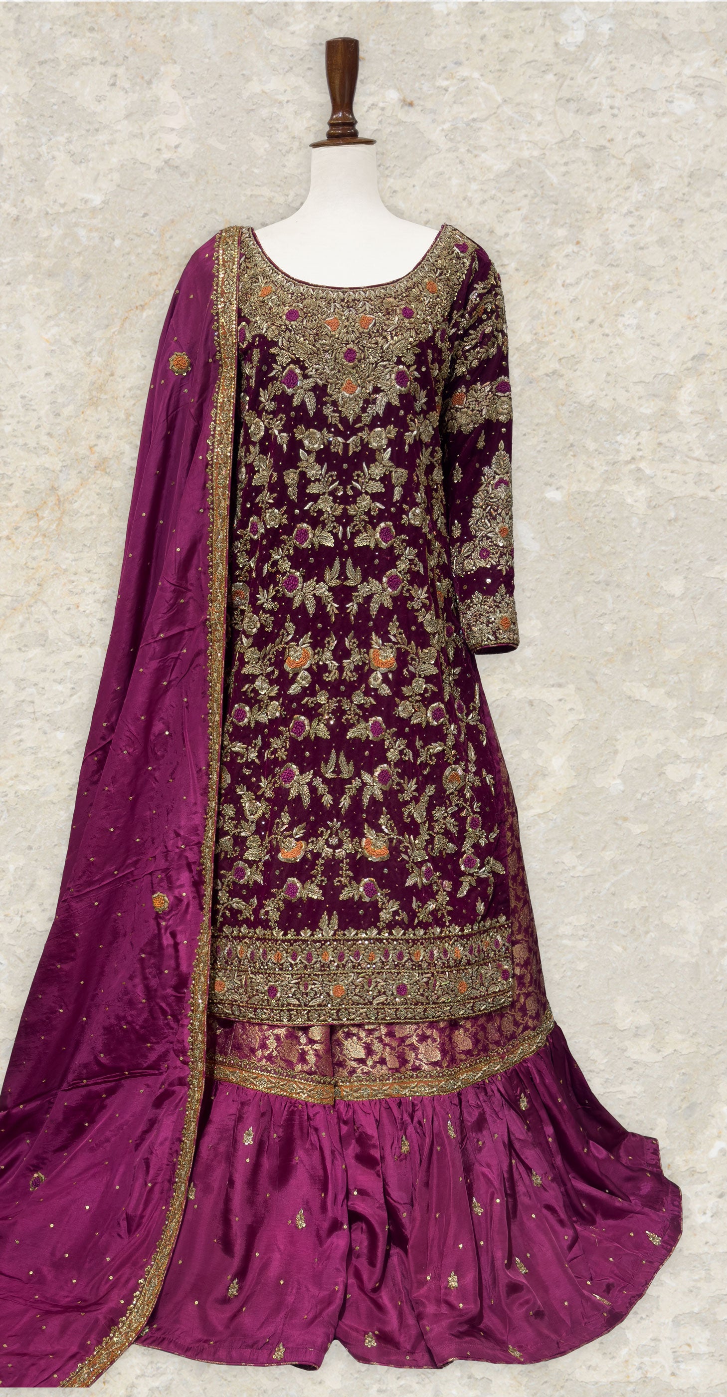 An opulent Farshi Lehenga crafted from rich Velvet and Silk, exuding luxury and grandeur. The ensemble is adorned with pure hand-made Zardozi Kacha work and intricate Kamdani detailing, adding timeless elegance and royal charm. The deep Magenta hue enhances its majestic look, making it a perfect masterpiece for bridal and formal occasions.