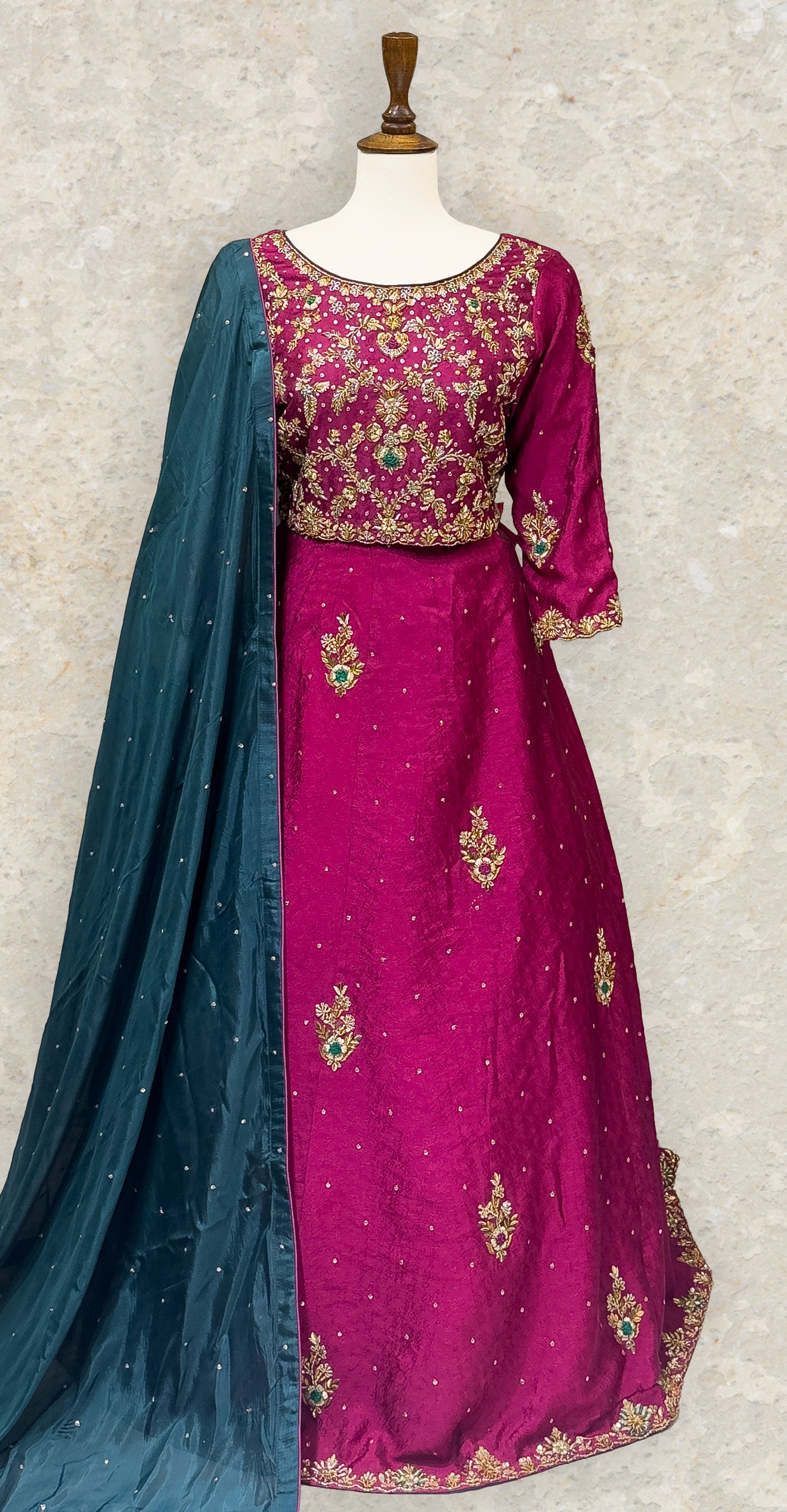 A radiant expression of grace and grandeur, this hot pink lehenga choli is crafted from luxurious Russian silk and adorned with pure hand-embroidered Zardozi kacha work.