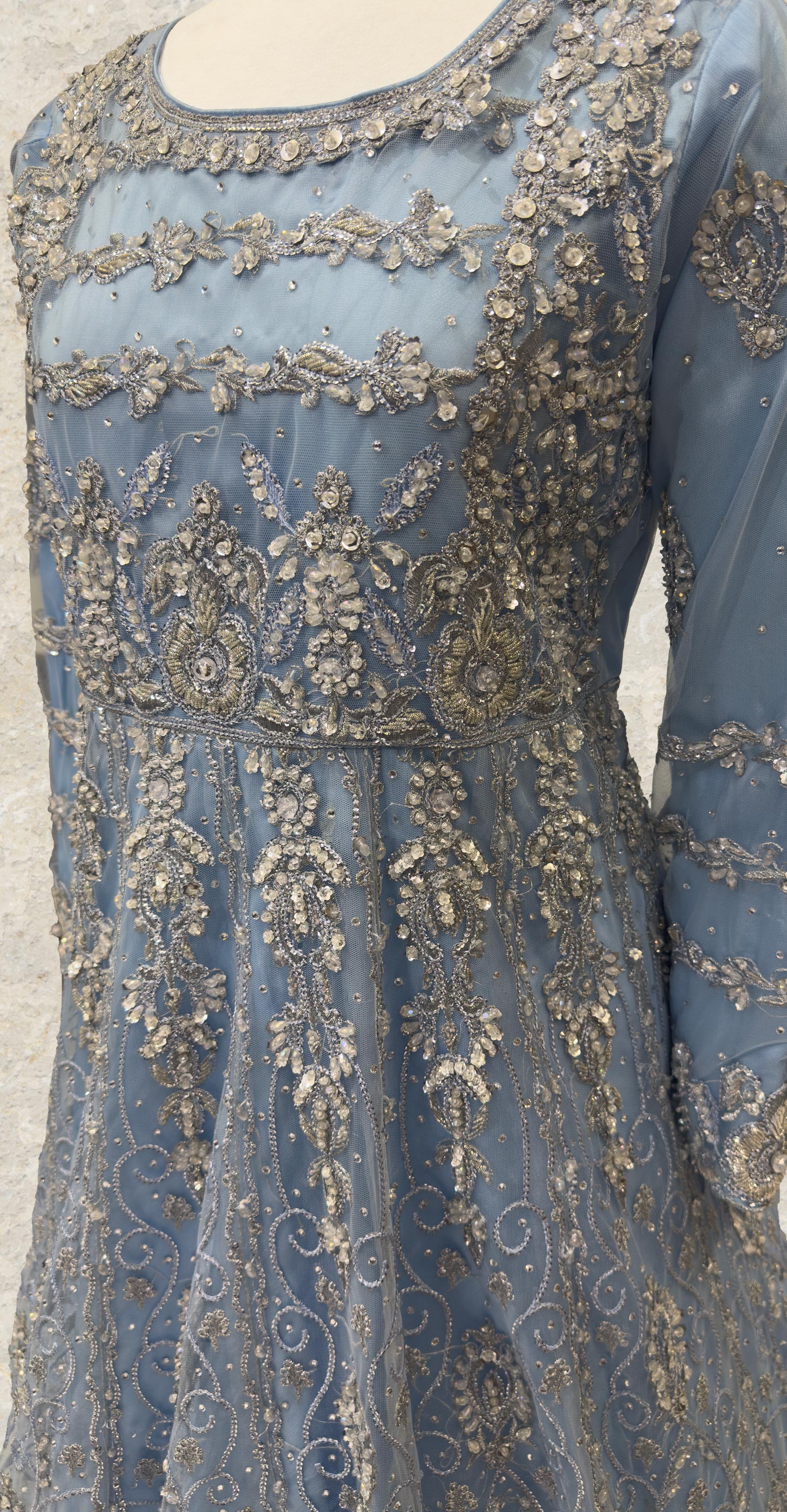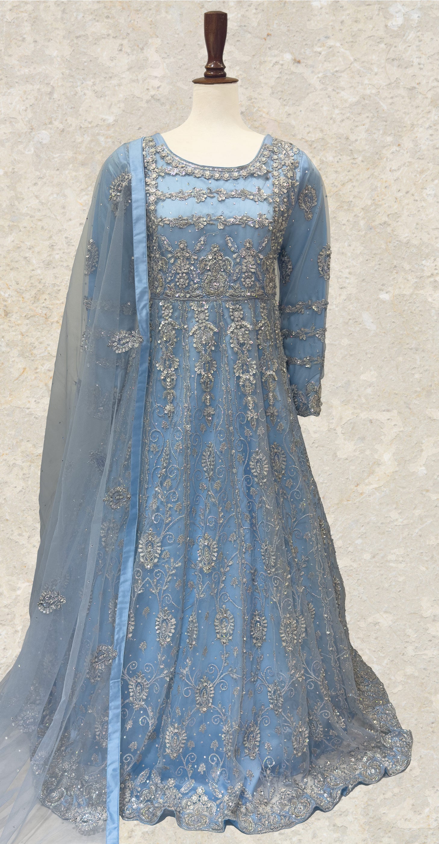 Grace meets craftsmanship in this breathtaking Asmani Maxi, tailored from premium net fabric and adorned with exquisite handmade Zardozi and Zari Sitara work. Each piece is intricately designed by skilled artisans, showcasing traditional embroidery with a modern, graceful silhouette.