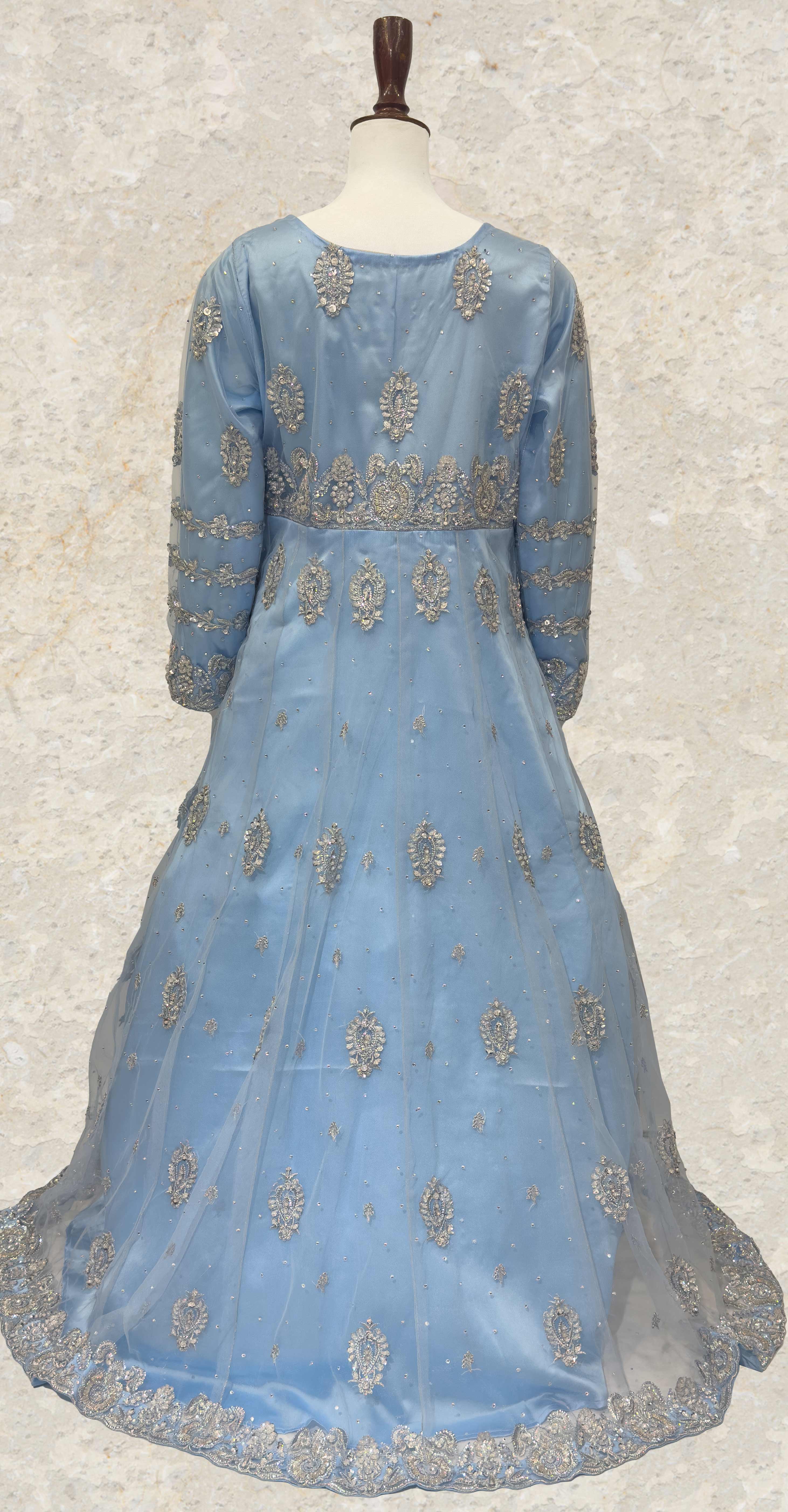 The soft Asmani (sky-blue) hue adds a serene and elegant charm, making it a perfect choice for wedding festivities, formal gatherings, or special occasions. Delicate details and refined embellishments elevate its timeless beauty and sophistication.