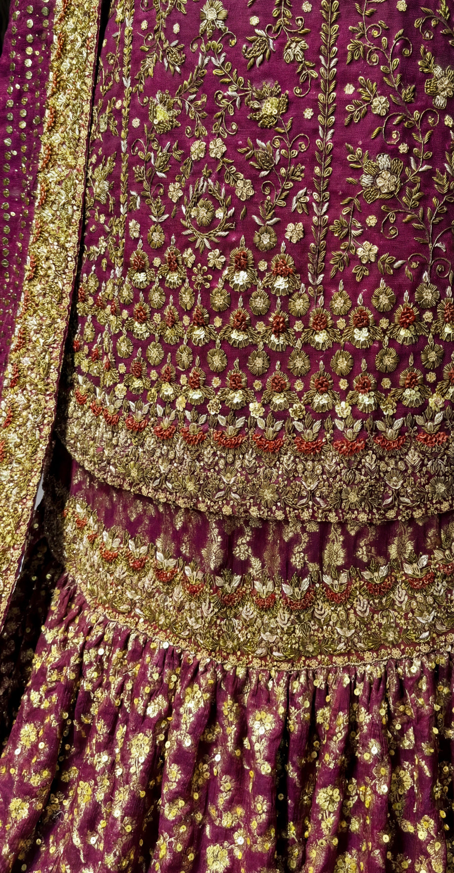 - Classic Farshi lehenga silhouette enhanced with fine handcrafted detailing