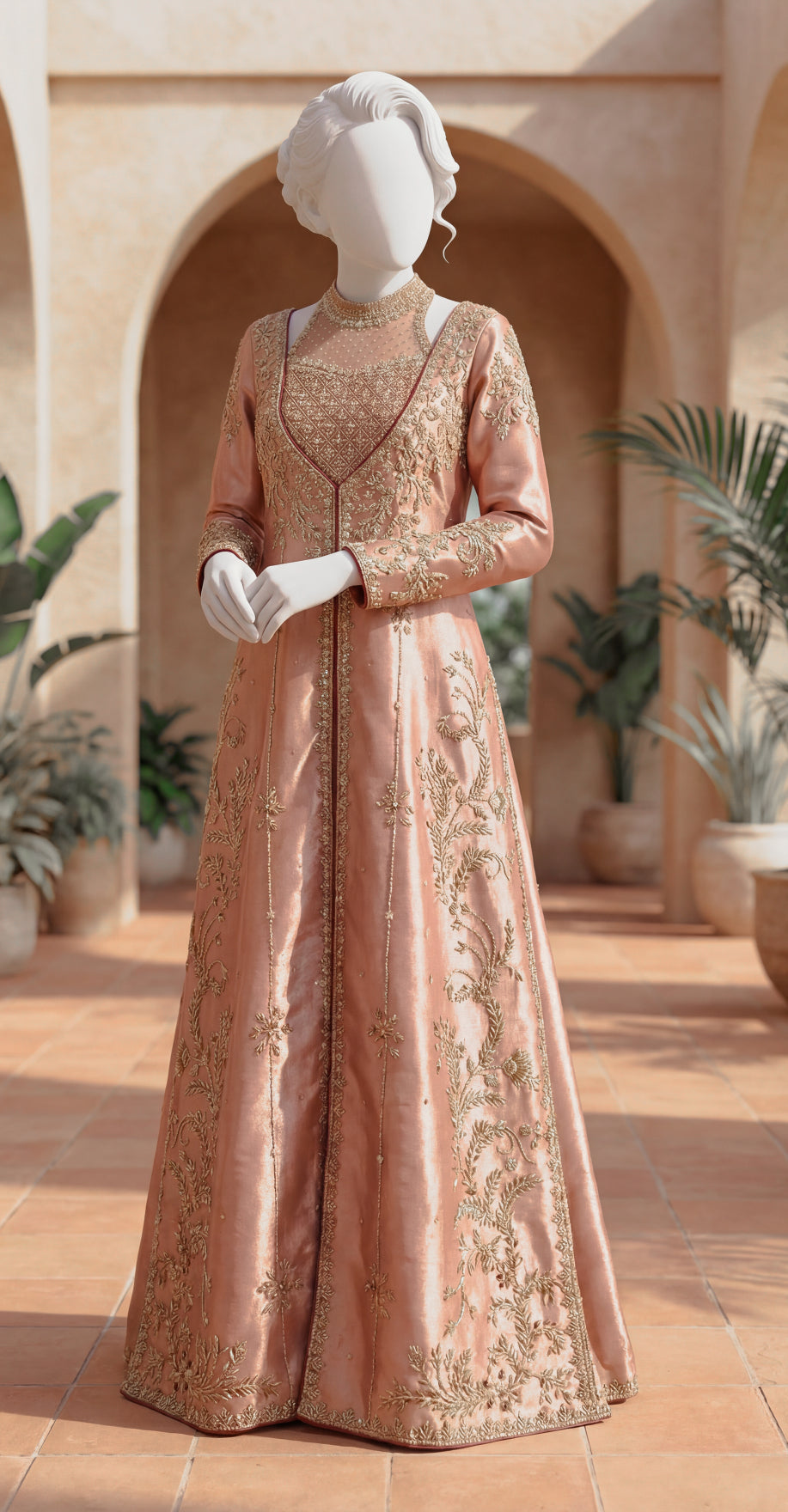 A luxurious Peach Long Coat crafted in rich Lama Tissue Fabric, adorned with exquisite pure hand-done Kacha Zardozi work.
